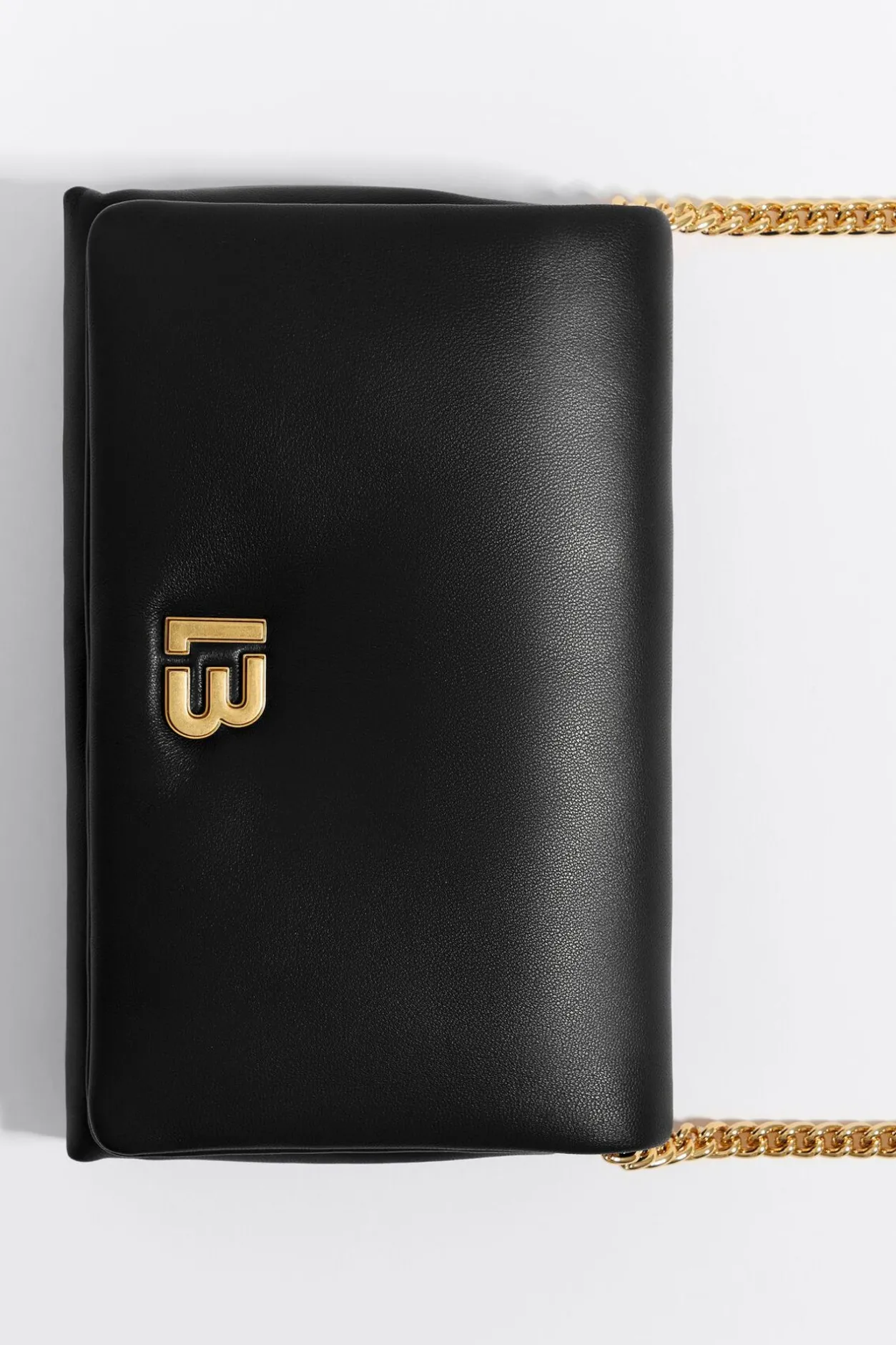 Bolso Bandolera De Piel Napa En Color Negro. Modelo De TamaÑO Mini Con Cierre De Solapa, Asa De Cadena Y Bolsillo Interior. Exterior Personalizado Con Logo Lb MetÁLico.