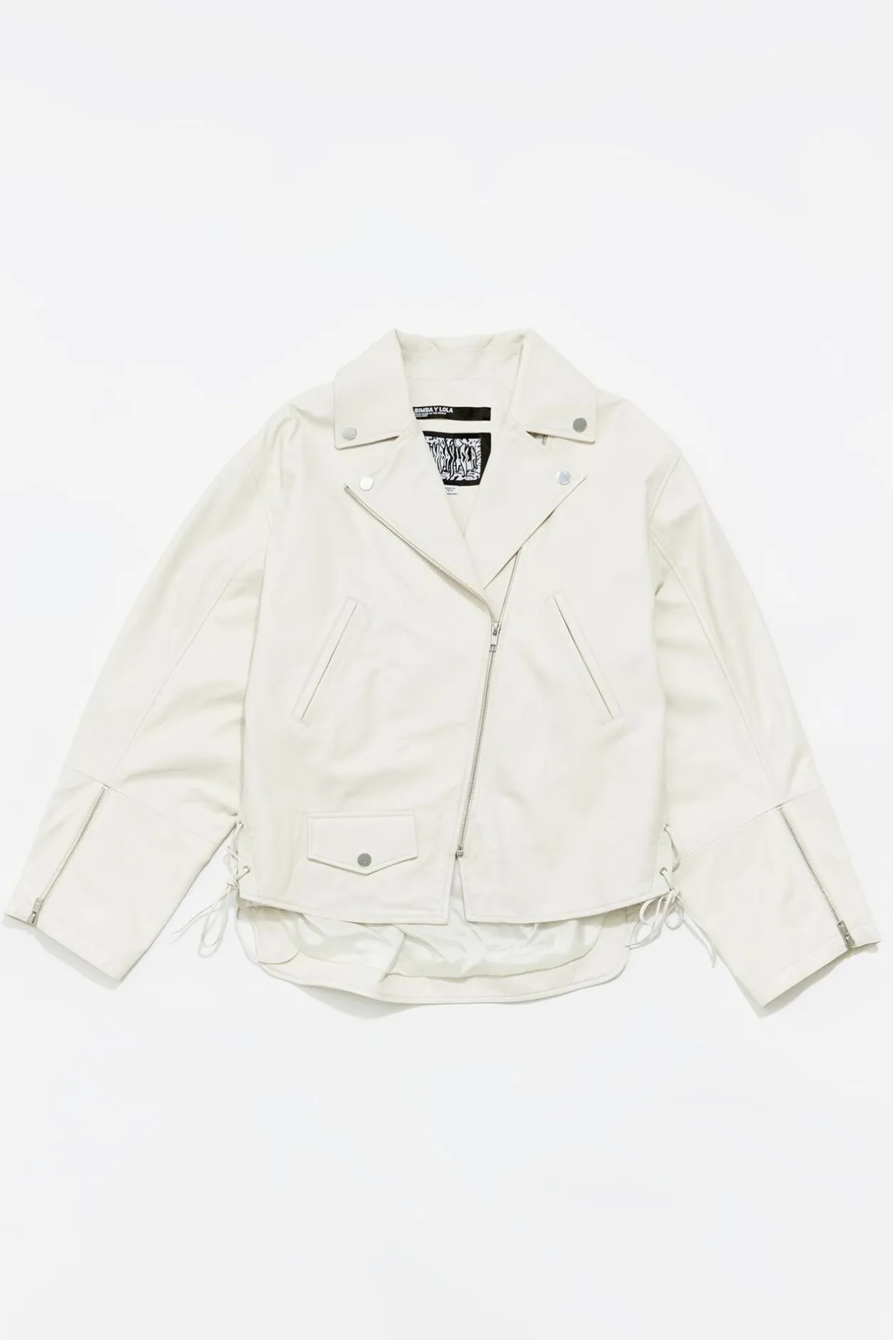 Cazadora Biker De Piel En Color Gris Hielo. Modelo Con Cuello Camisero, Manga Larga Con Cremalleras MetÁLicas En PuÑOs Y Cierre Frontal Con Cremallera MetÁLica. Bolsillos Frontales Con Vivo Y Cordones Ajustables De Piel A Los Laterales.
