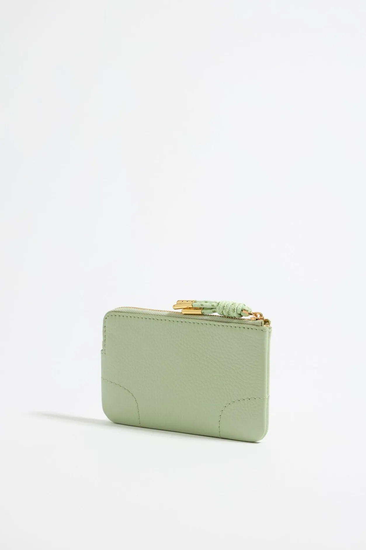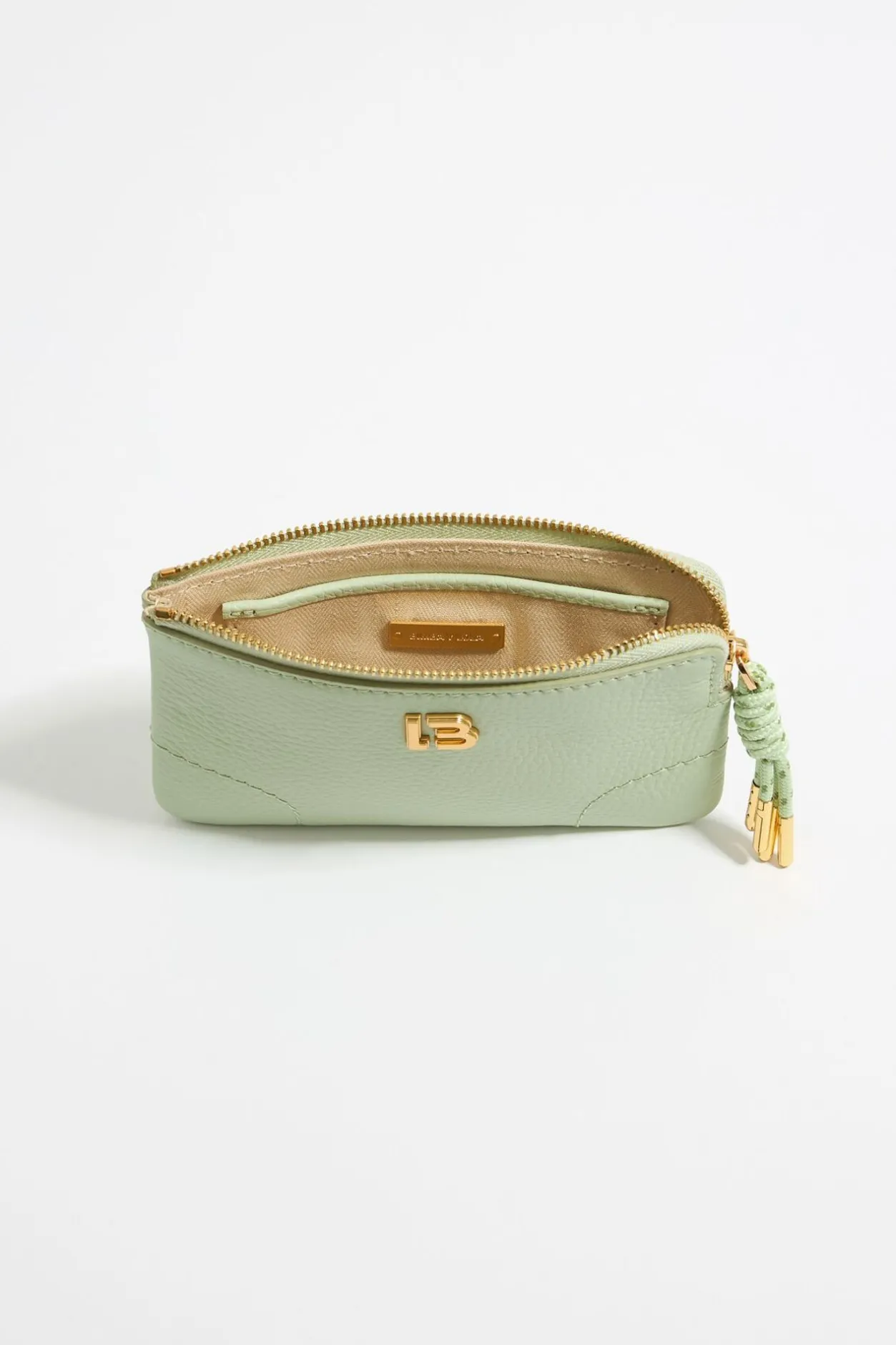 Monedero De Piel En Color Verde Pastel. Modelo Con Cierre De Cremallera, Tirador Con Cabo Y Bolsillo Interior. Exterior Personalizado Con Logo Lb. Este Modelo Contiene 100% AlgodÓN Reciclado.