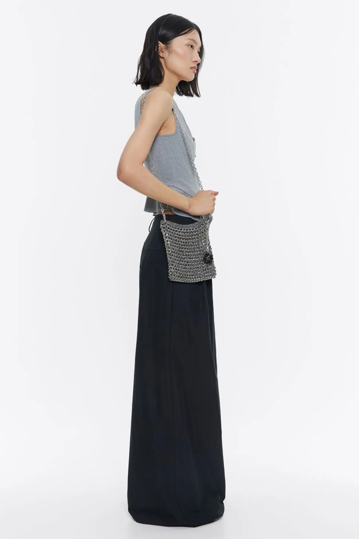 Bolso Saca De Crochet Con Cadena En Color Plata. Modelo De TamaÑO Mini, Cierre MagnÉTico Y Asa De Cadena. Exterior Personalizado Con Charm Con Chimo MetÁLico.