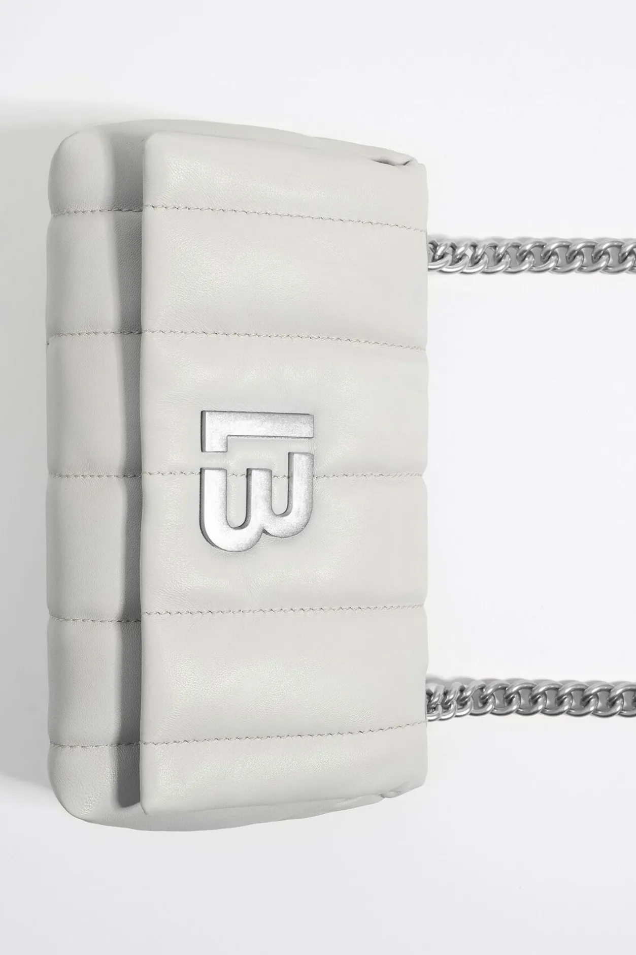 Bolso Solapa De Napa En Color Blanco Roto. Modelo De TamaÑO PequeÑO, Cierre MagnÉTico, Asa Larga De Piel Y Cadena, Y Bolsillo Interior. Exterior Personalizado Con Logo Lb. Este Modelo Contiene 100% PoliÉSter Reciclado.