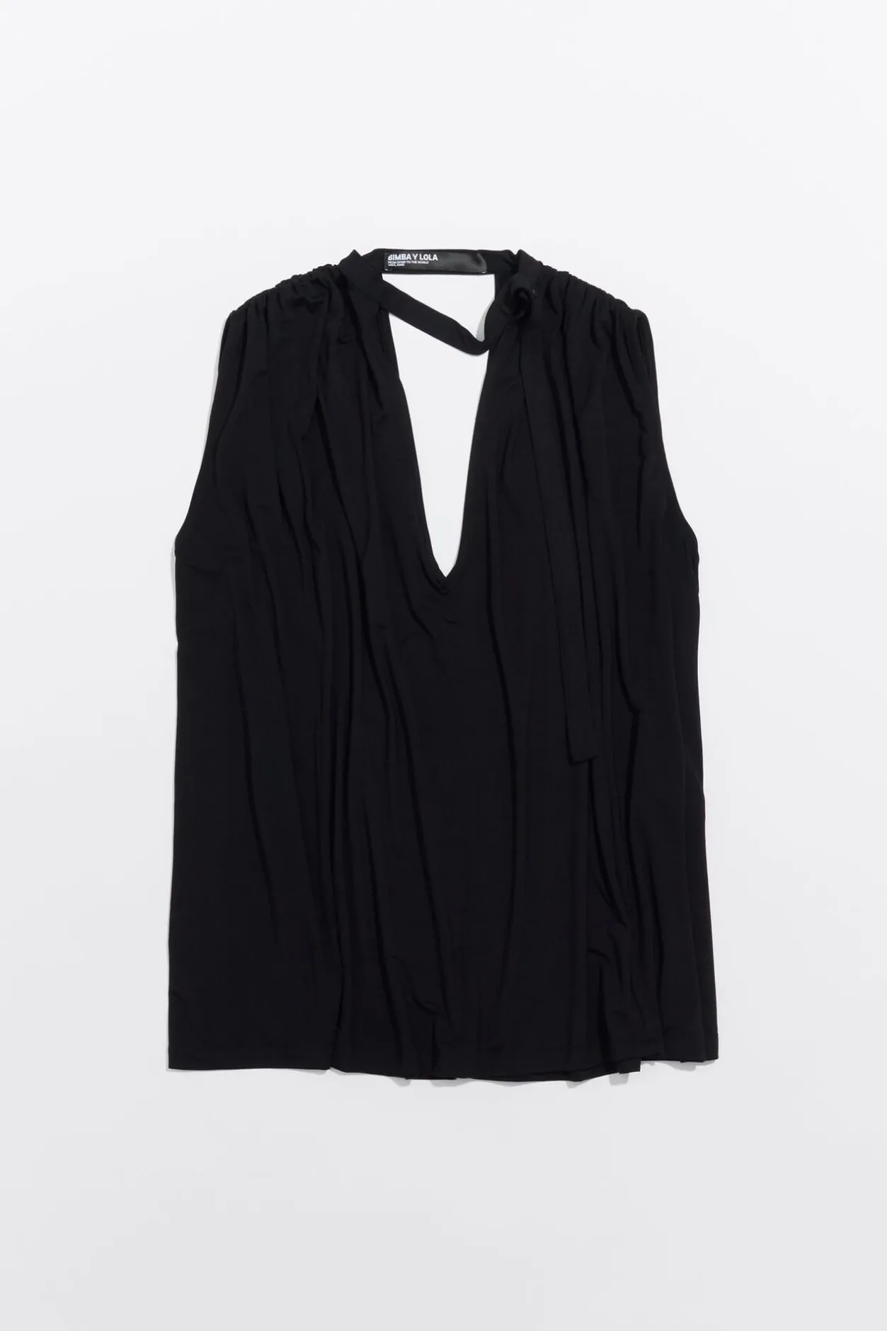 Camiseta De Viscosa En Color Negro. Modelo De Corte LÍNea A, Escote En Pico Con Tira En El Cuello Con BotÓN, Manga Sisa Y Minipliegues En Hombros Para Dar Volumen.