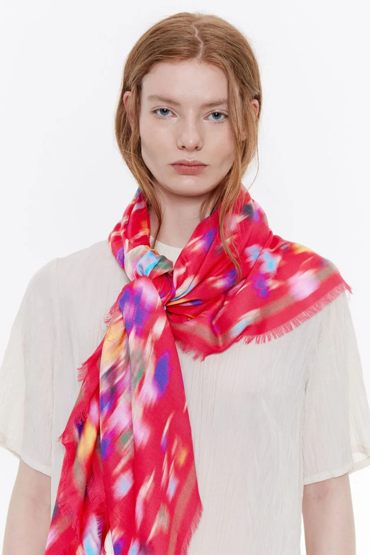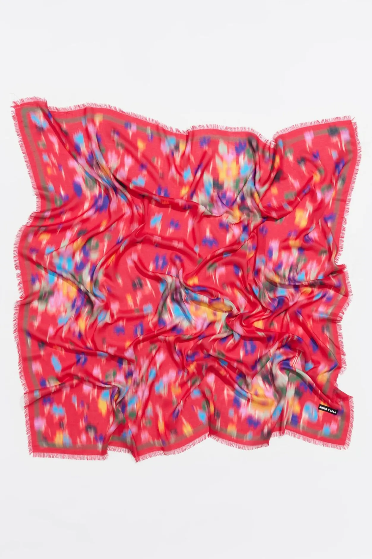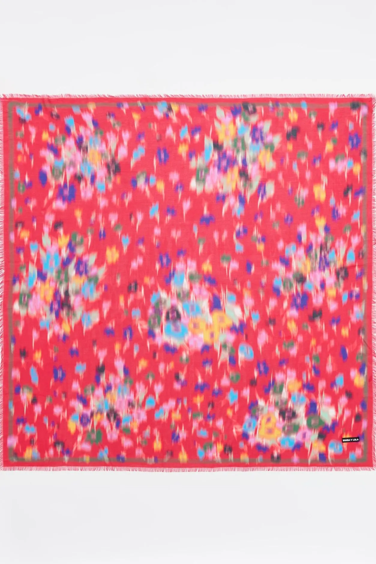 Chal Cuadrado Con Estampado De Flores Difuminadas En Grupos Sobre Fondo Color Fresa. Modelo Personalizado Con Etiqueta Logo.