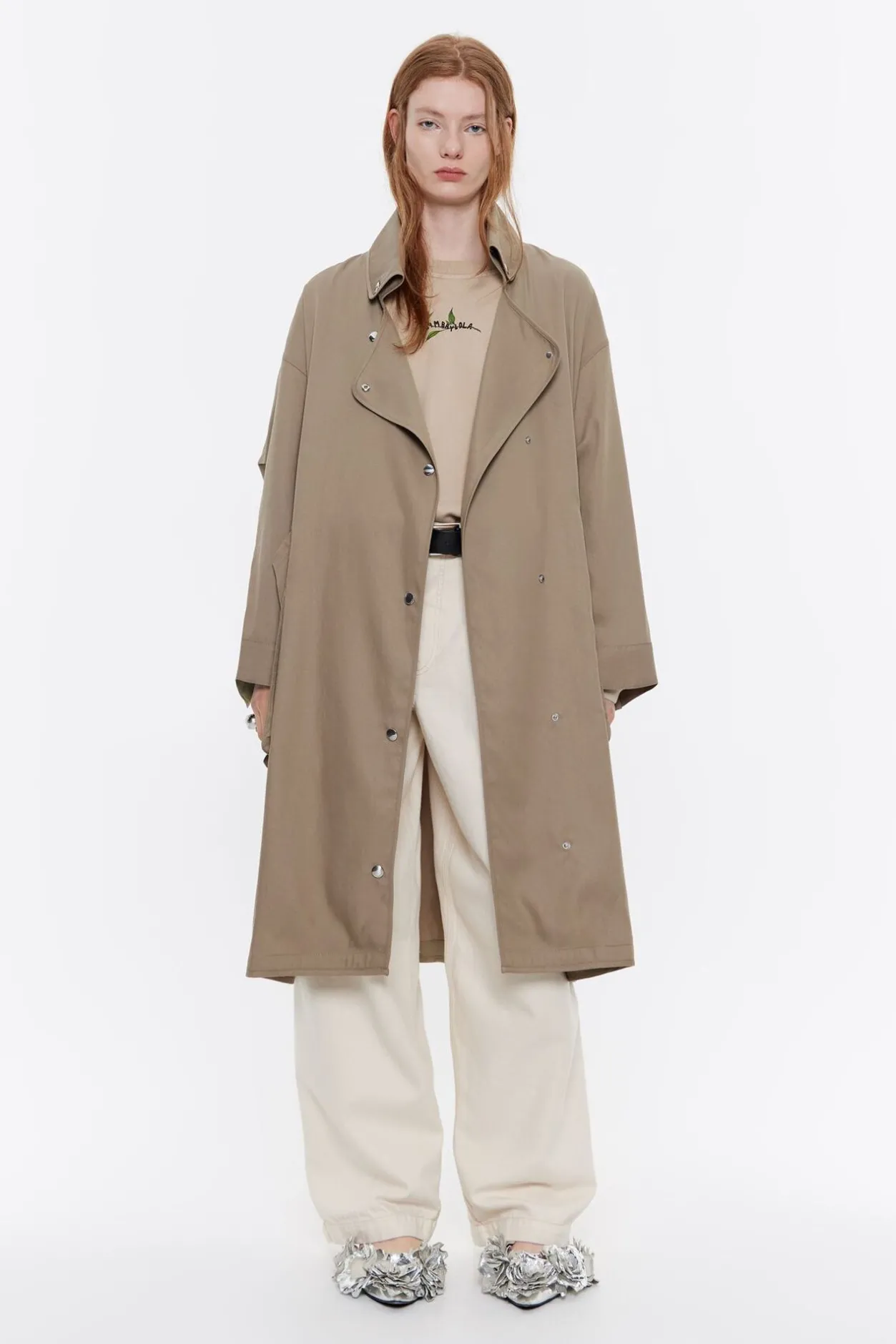 Gabardina Midi De AlgodÓN En Color Caqui. Modelo De Corte Oversize, Con Cuello Alto Abierto, Manga Larga Con Pinzas En El Codo Y Cierre Frontal Con Botonadura De PresiÓN. Bolsillos De Fuelle En El Delantero.