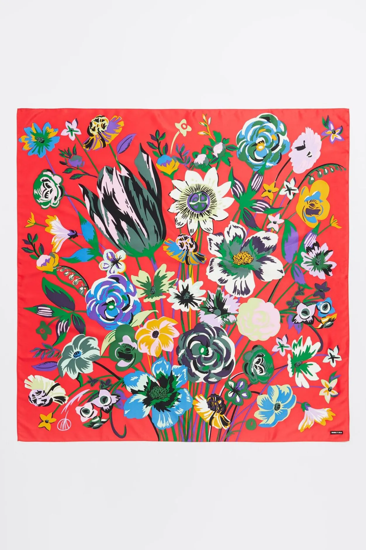 PaÑUelo Cuadrado Con Estampado De Ramo De Flores Sobre Fondo Frambuesa. 100% PoliÉSter Reciclado.