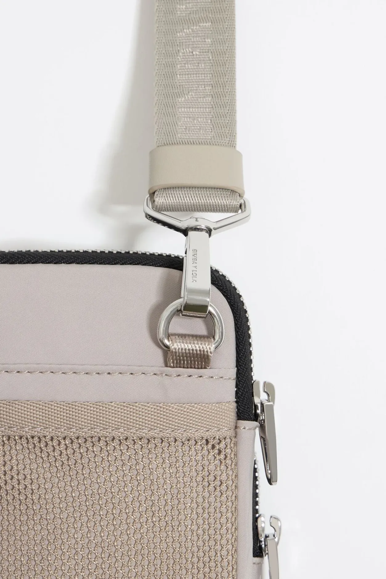 Bolso Bandolera De Nylon En Color Arena. Modelo De TamaÑO Mini, Cierre De Cremallera, Asa De Tejido Logotipada Ajustable, Piezas De Piel Y Tarjetero Interior. Exterior Personalizado Con Logo MetÁLico. Este Modelo Contiene 100% PoliÉSter Reciclado.