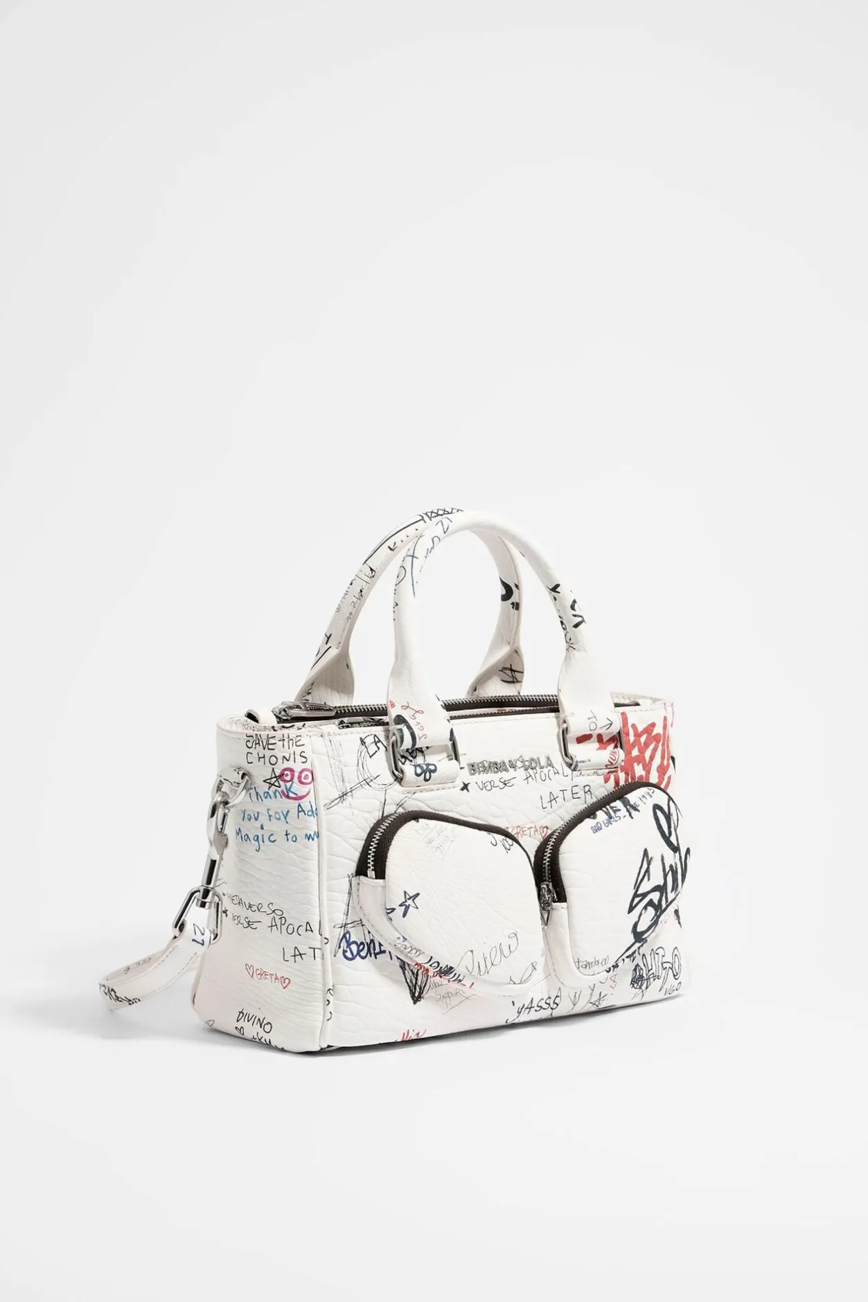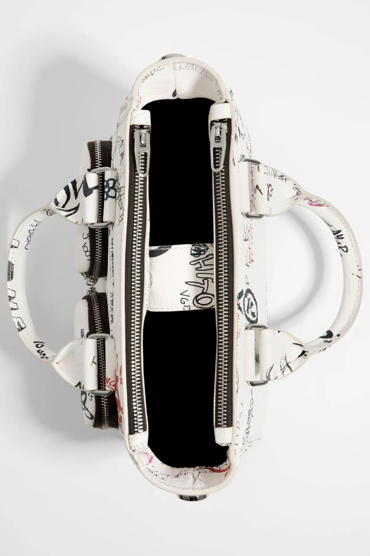 Bolso Tote Pocket De Piel Con Print Wall Is Love En Color Blanco. Modelo De TamaÑO Mediano, Con Dos Compartimentos Con Cierre De Cremallera Y Tira De Piel Con Snap, Doble Asa De Mano Y Asa Bandolera De Piel. Interior Personalizado Con Etiqueta De Piel. Exterior Personalizado Con Logo MetÁLico.