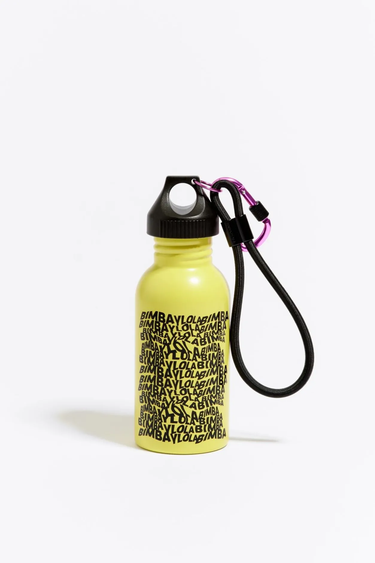 Botella De Acero Inoxidable Personalizada Con El Logo Estampado De Bimba Ola En Color Amarillo. Modelo Con Cabo Para Colgar, Cierre HermÉTico De Rosca Y MosquetÓN.