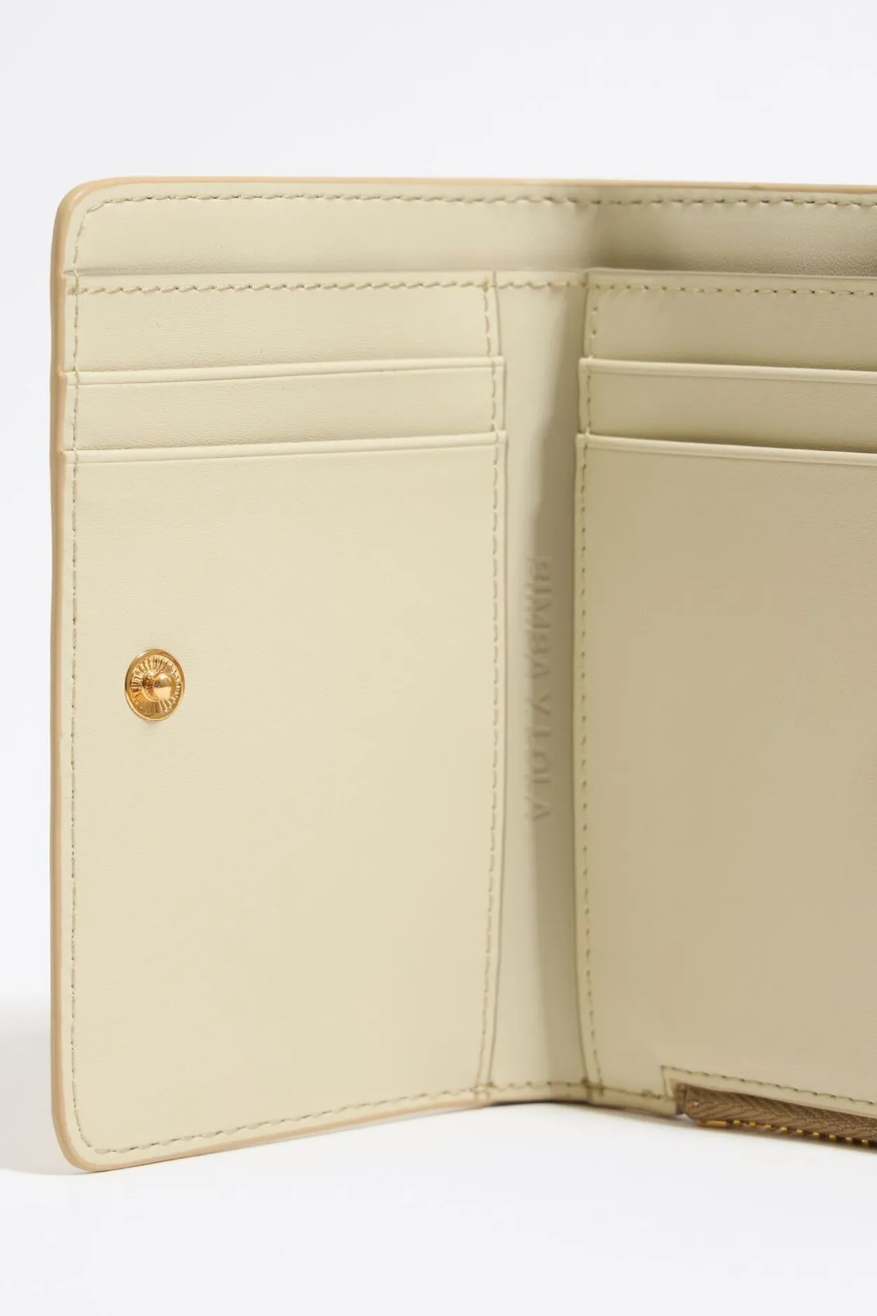Cartera De Piel En Color Oro. Modelo Con Cierre De Cremallera Y Cierre A PresiÓN, Tarjetero Interior Y Tirador De Piel. Exterior Personalizado Con Logo Estampado.