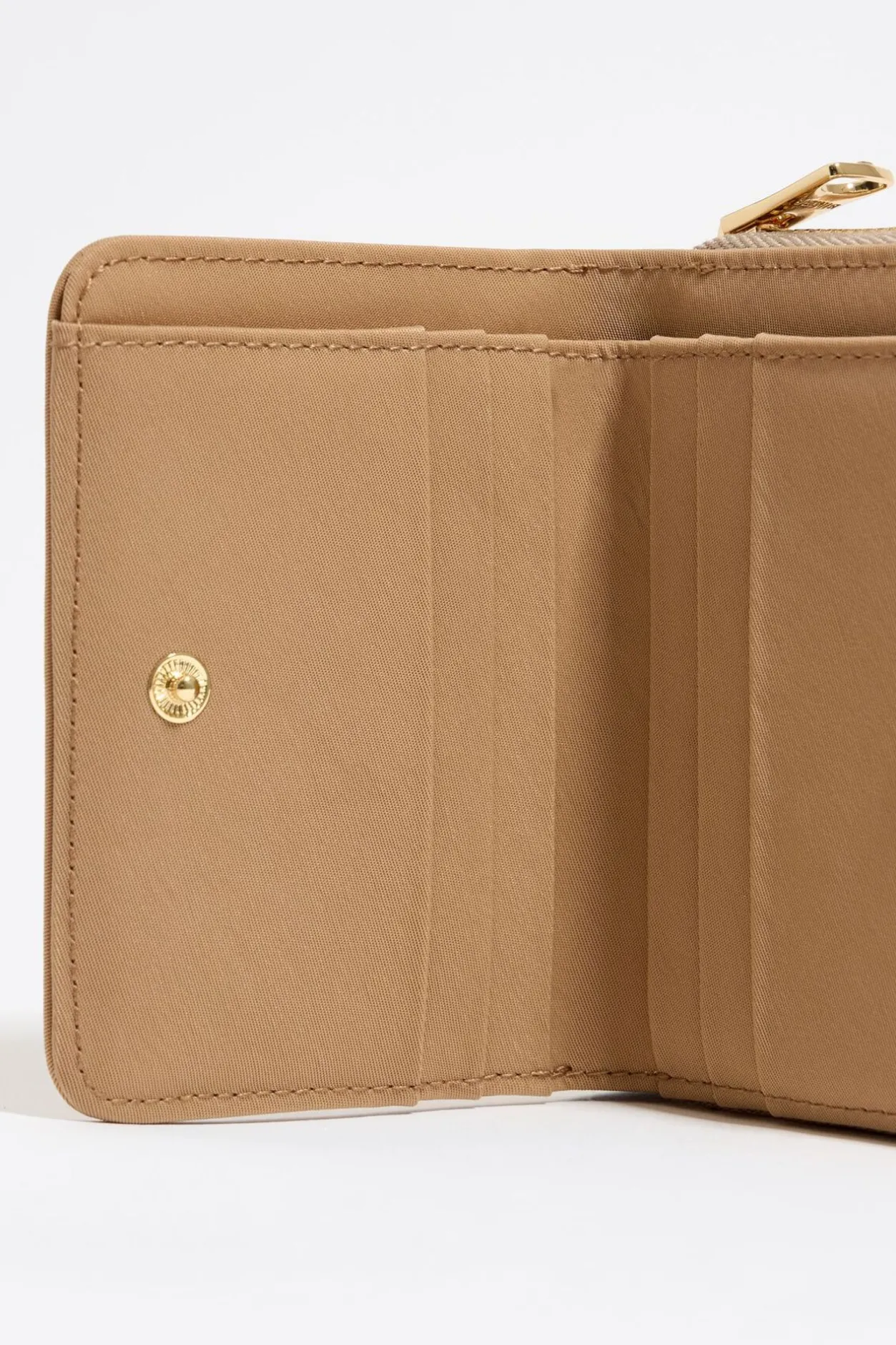 Cartera De Nylon En Color Tostado. Modelo Con Solapa Frontal De Snap, Cierre De Cremallera Y Tarjetero Interior. Exterior Personalizado Con Logo MetÁLico.