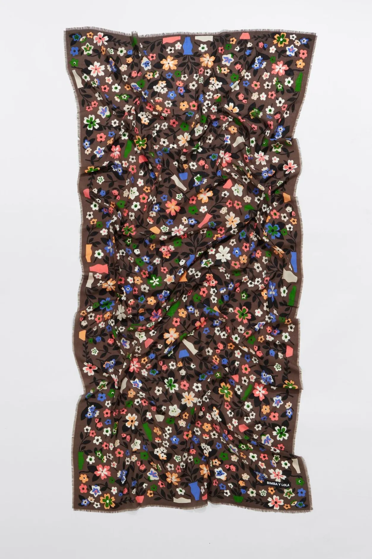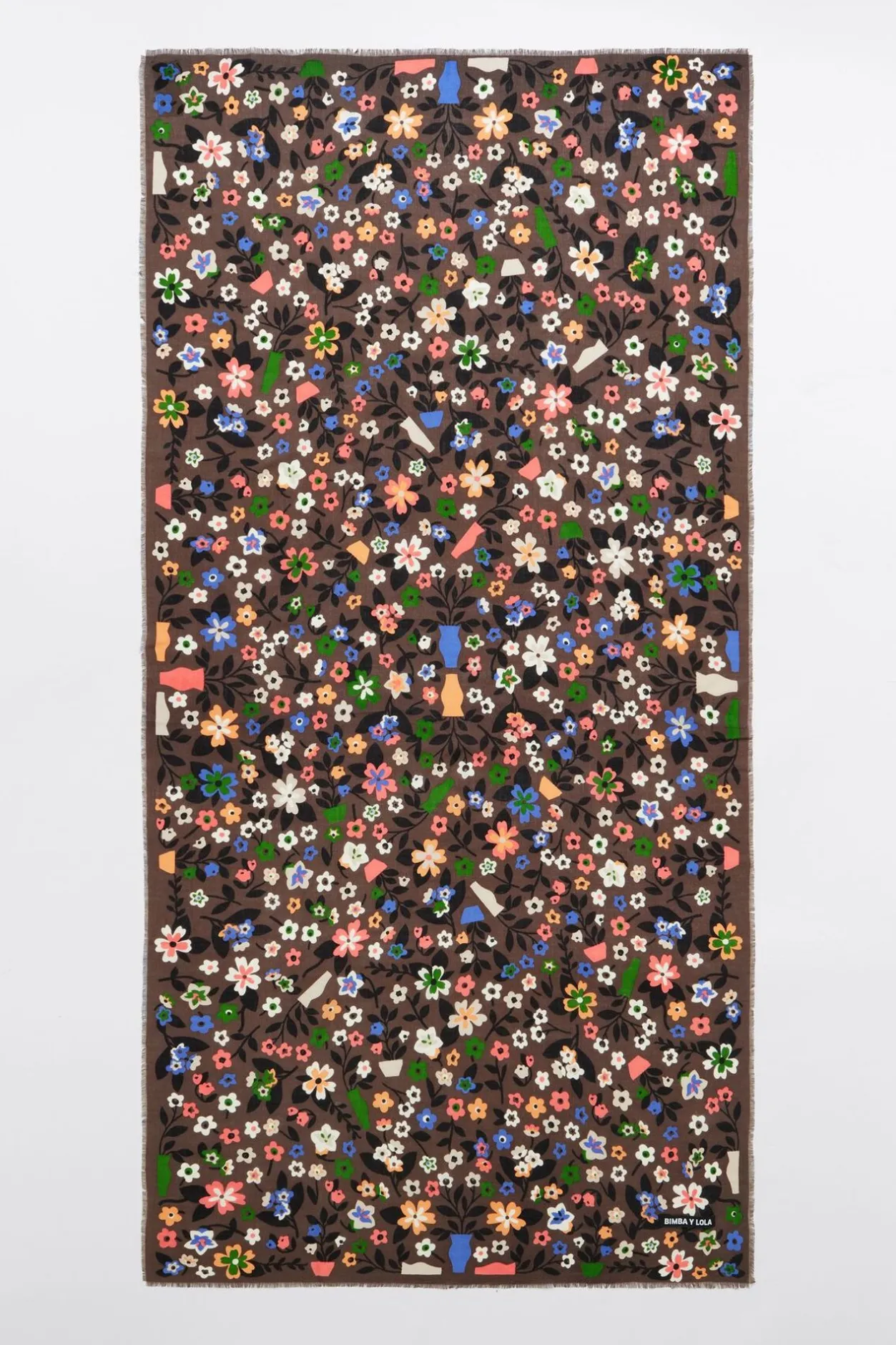 Chal Rectangular Con Estampado De Flores Y Jarrones Naif Multicolor Sobre Fondo Topo.