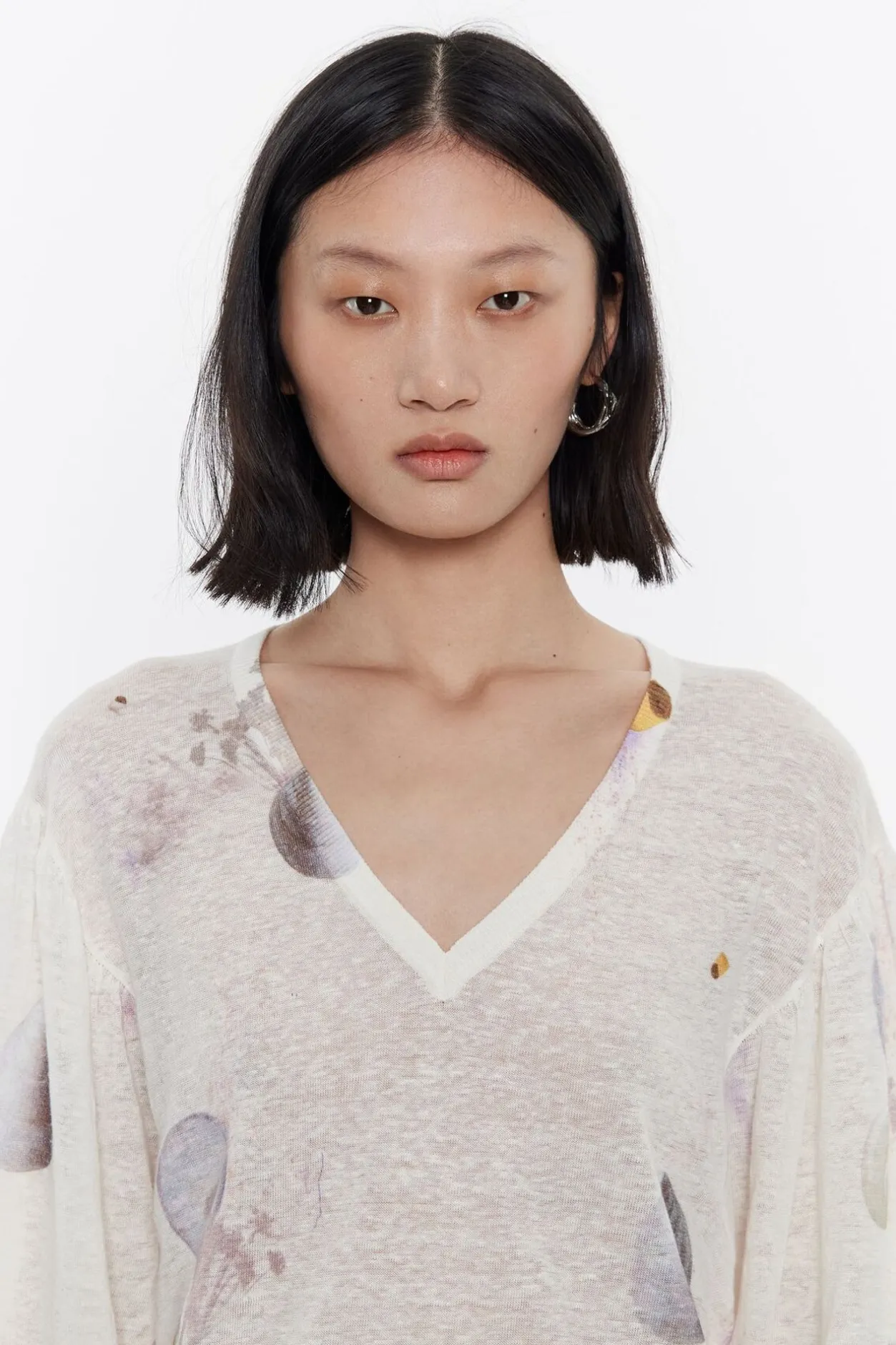 Jersey De Lino Con Print Waves En Color Marfil. Modelo De Corte Recto, Escote En V Pronunciado Y Manga 3/4 Abullonada Con ElÁSticos En PuÑOs.