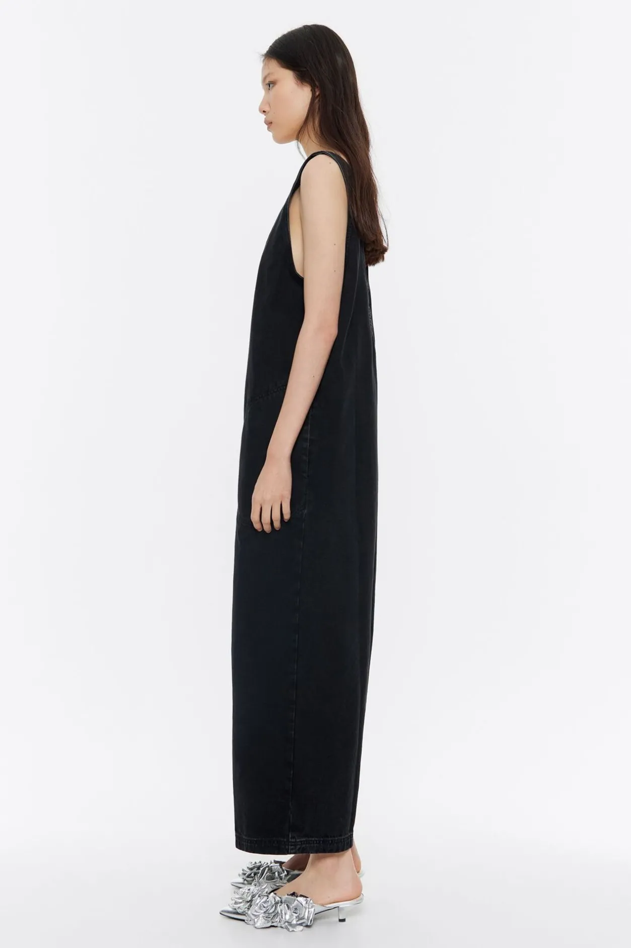 Mono Largo De AlgodÓN En Color Negro. Modelo De Corte Oversize, Escote Redondo Pronunciado, Manga Sisa Y Bolsillos En Costuras. Exterior Personalizado Con Logo Bordado. Este Modelo Contiene 20% Fibras Recicladas.