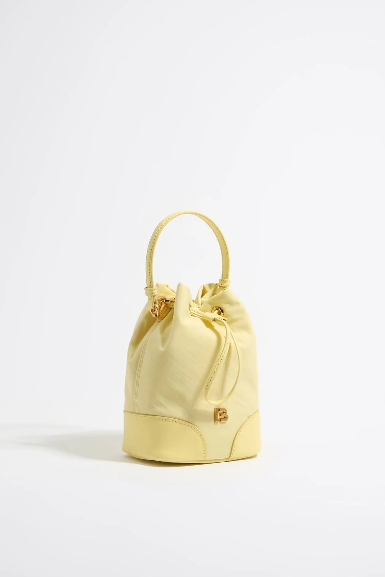 Bolso Saca De Nylon En Color Amarillo Claro. Modelo Con Cierre Ajustable De Piel, Asa De Piel Y Bolsillo Interior. Exterior Personalizado Con Logo Lb.