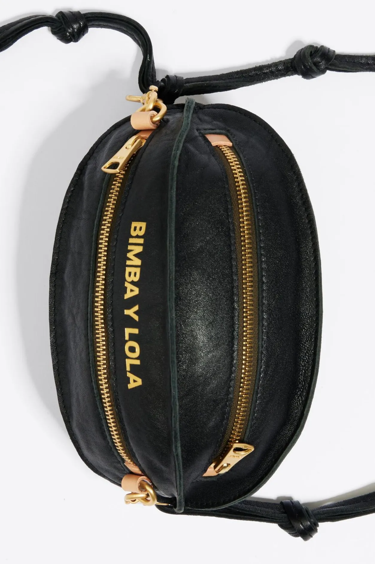 Bolso Bandolera De Piel Con Forma De Pelota En Color Negro. Modelo De TamaÑO PequeÑO Con Dos Compartimentos Con Cierre De Cremallera Y Asa Regulable En Piel. Exterior Personalizado Con Logo Estampado Metalizado.
