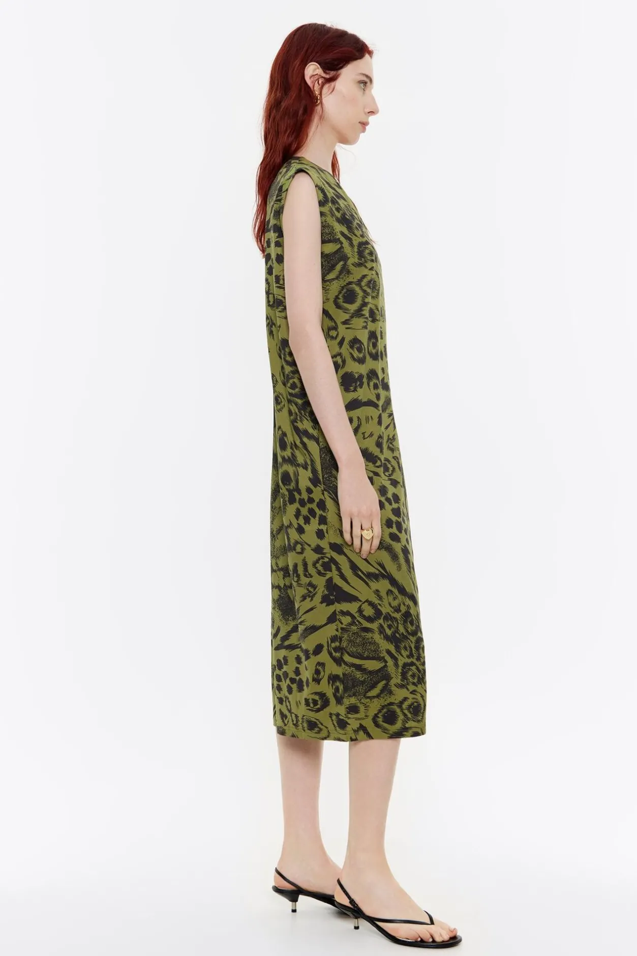 Vestido Midi De AlgodÓN Con Print Animal Mix En Color Verde. Modelo De Corte Recto, Escote En V, Manga Sisa Y Abertura En Pico En La Espalda.