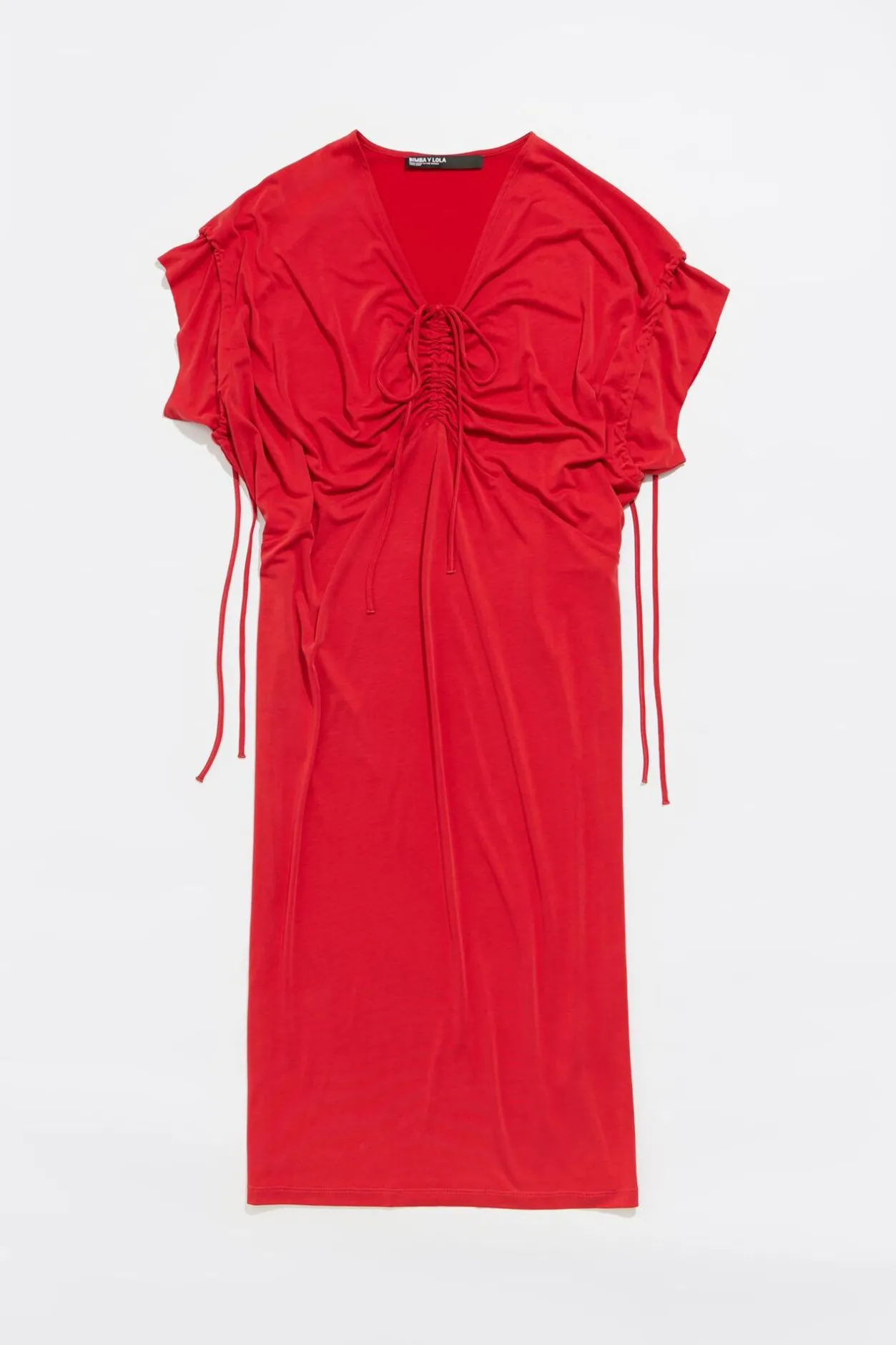 Vestido Fluido Midi En Color Rojo. Modelo De Corte Recto, Escote En V Pronunciado, Manga Corta MurciÉLago Con Cordones En La Sisa Para Ajustar Y Fruncido Frontal Con Cordones De Tejido.