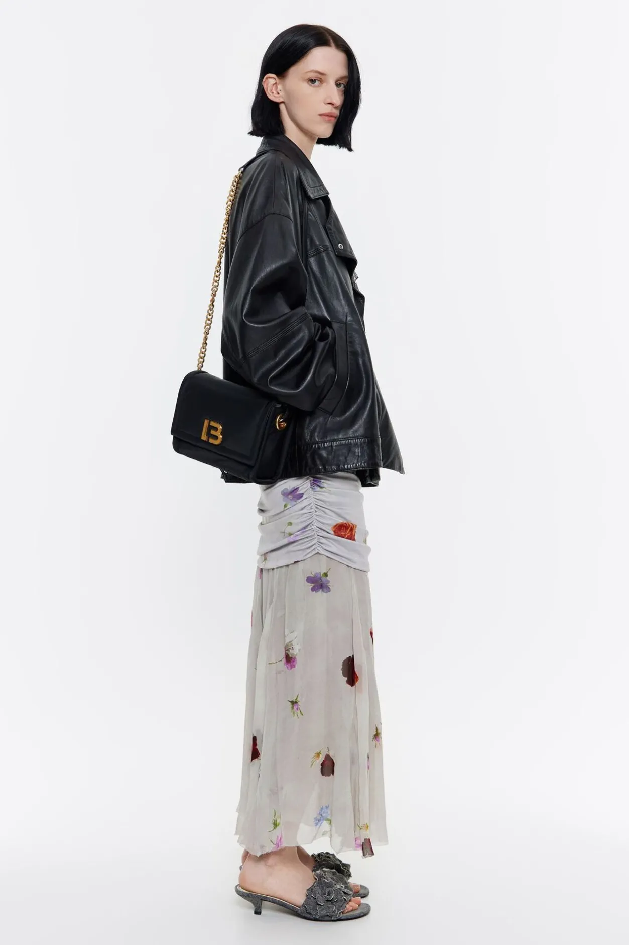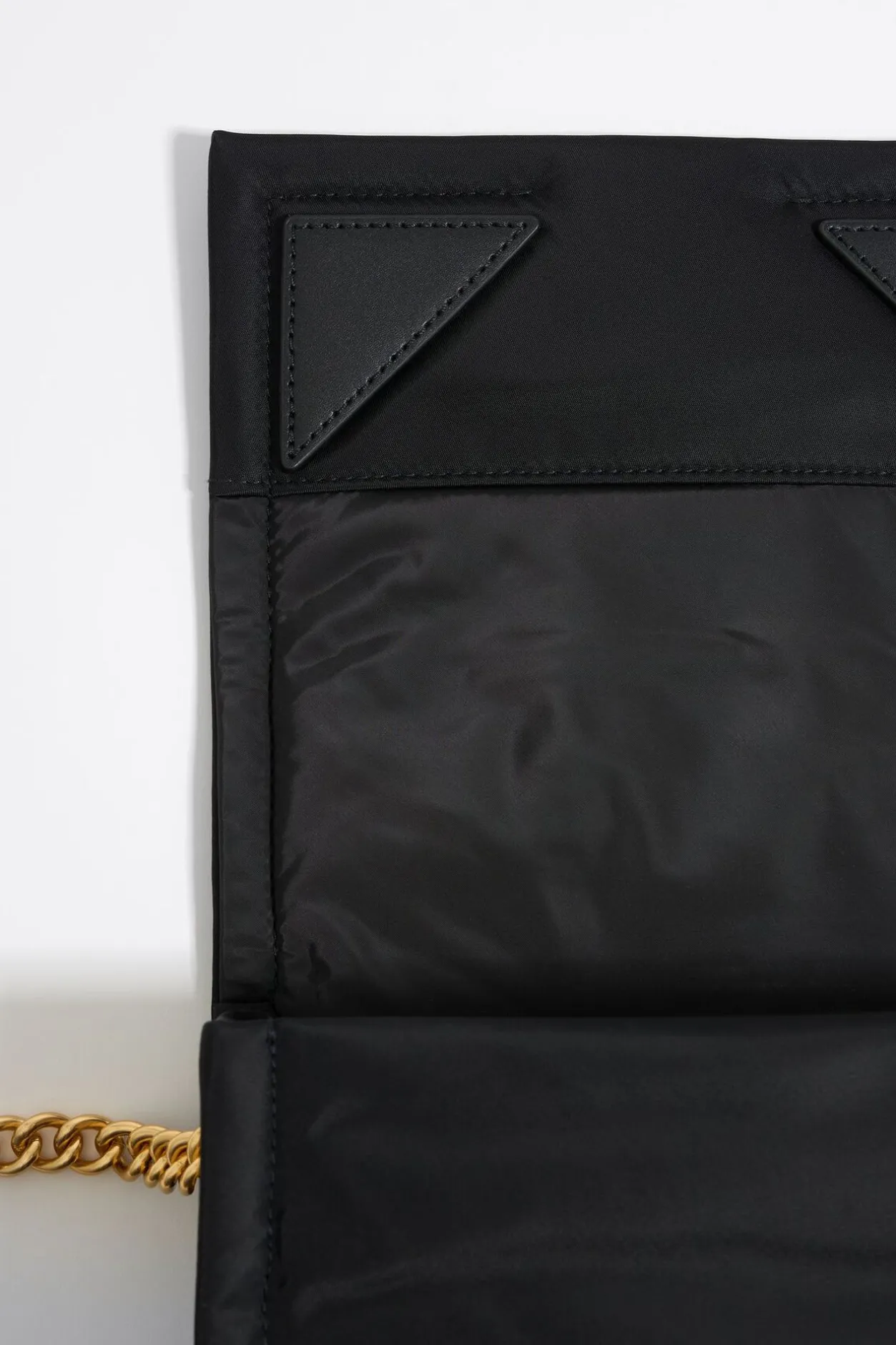 Bolso Solapa De Nylon En Color Negro. Modelo De TamaÑO PequeÑO, Cierre MagnÉTico, Asa Larga De Piel Y Cadena, Bolsillo Interior Y Piezas De Piel En El Interior De La Solapa. Exterior Personalizado Con Logo Lb. Este Modelo Contiene 100% PoliÉSter Reciclado.