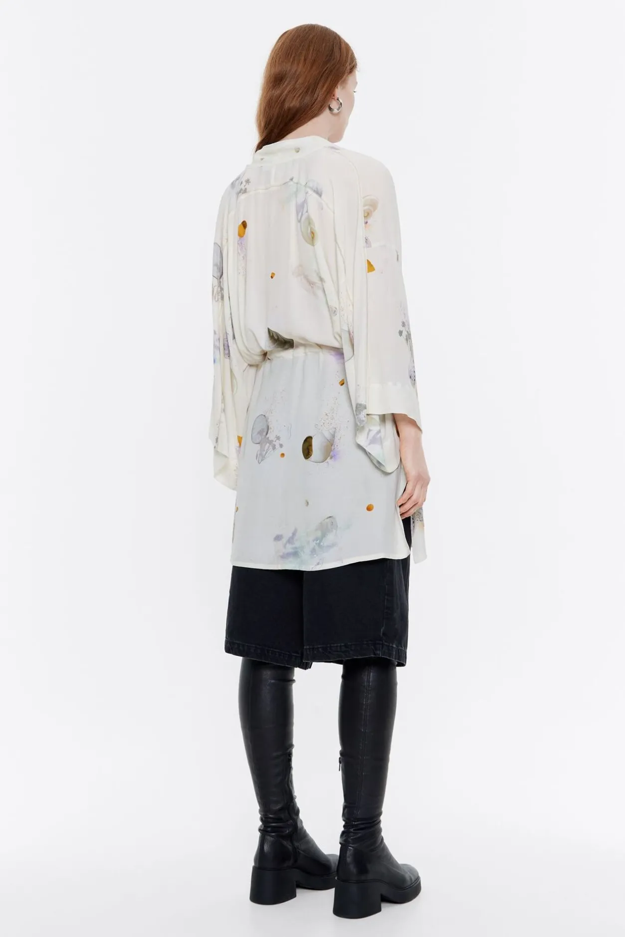 Camisa Kimono Larga De Viscosa Con Print Waves En Color Marfil. Modelo Con Escote Pronunciado Y Cruzado, Manga 3/4 Con Pespuntes En El PuÑO Y Cierre Frontal Con Botonadura. Cintura Con Cordones Para Ajustar.
