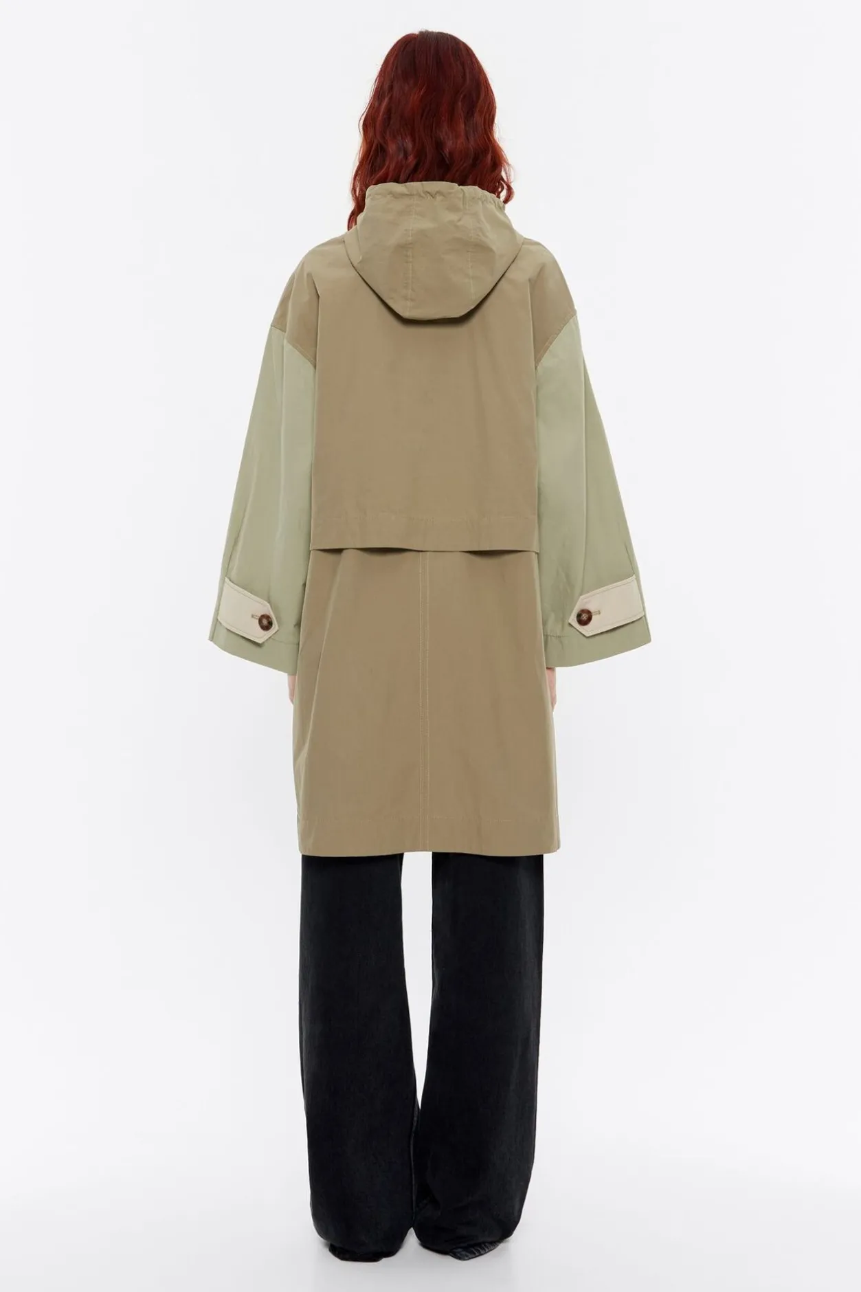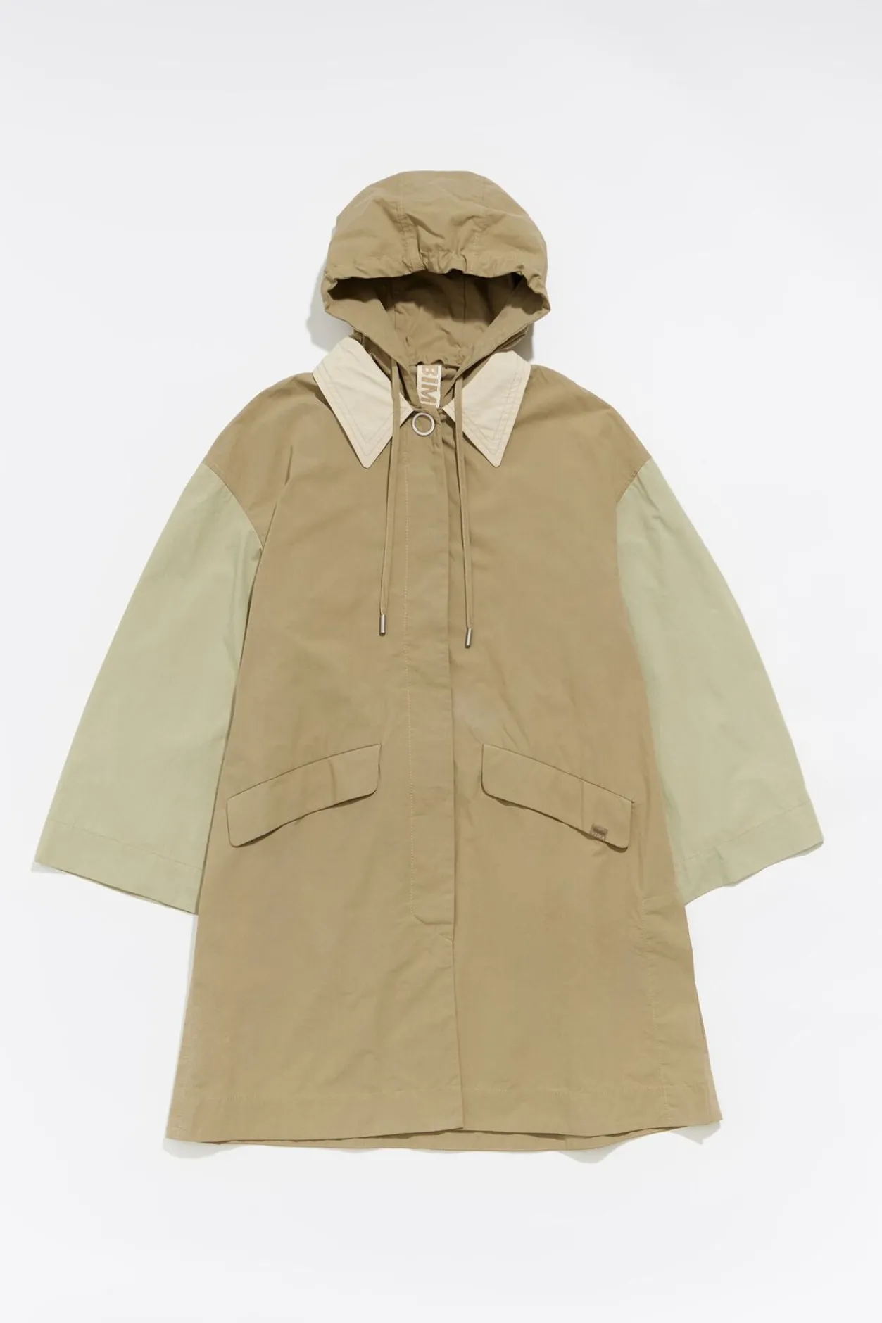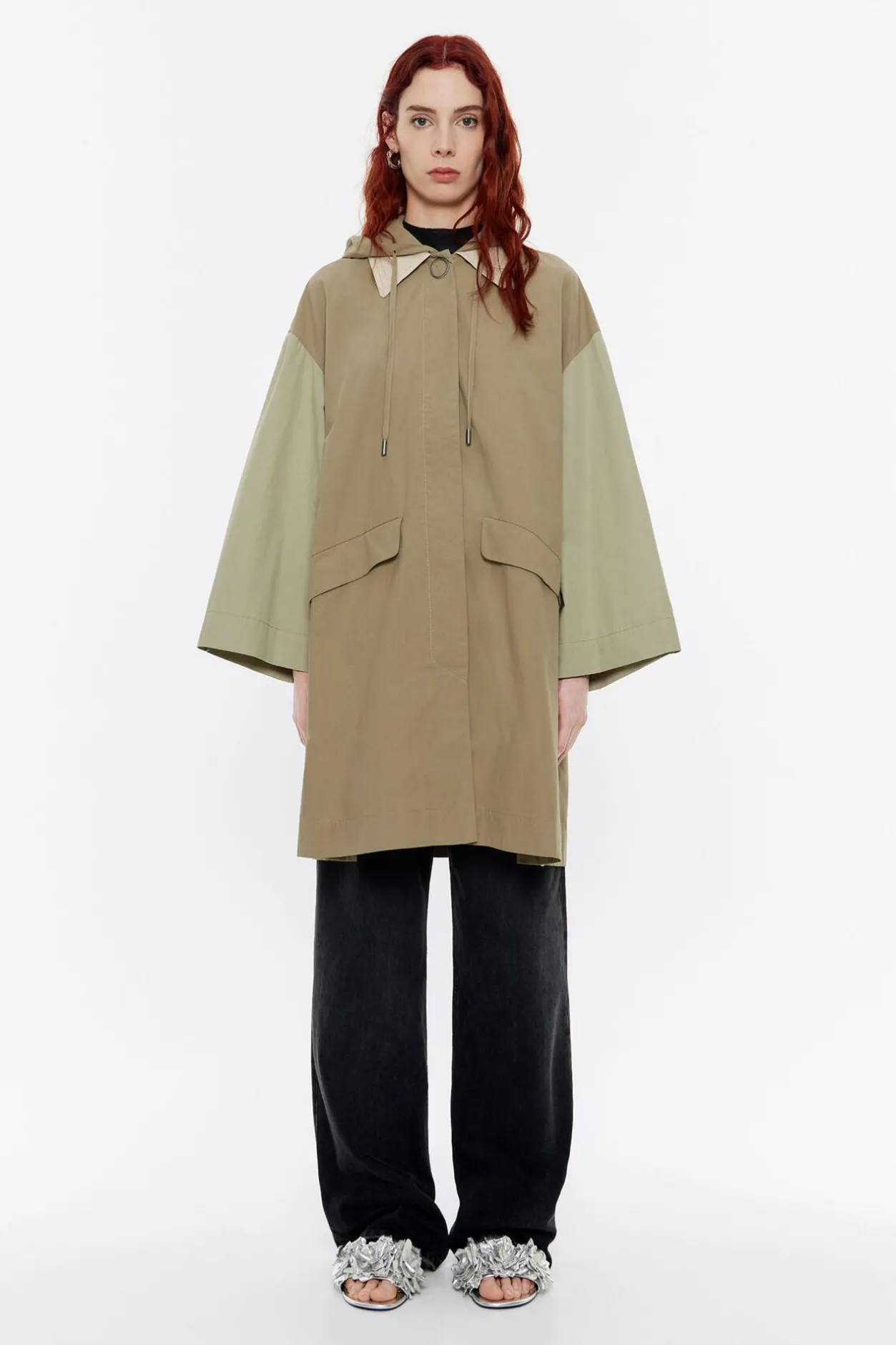 Gabardina Midi De AlgodÓN En Color Caqui Tricolor. Modelo De Corte LÍNea A, Cuello Camisero Con Capucha Desmontable, Manga Larga Ancha Y PuÑOs Con Trabilla Y BotÓN. Cierre Con Solapa Delantera Y Botones A PresiÓN MetÁLicos Visibles.