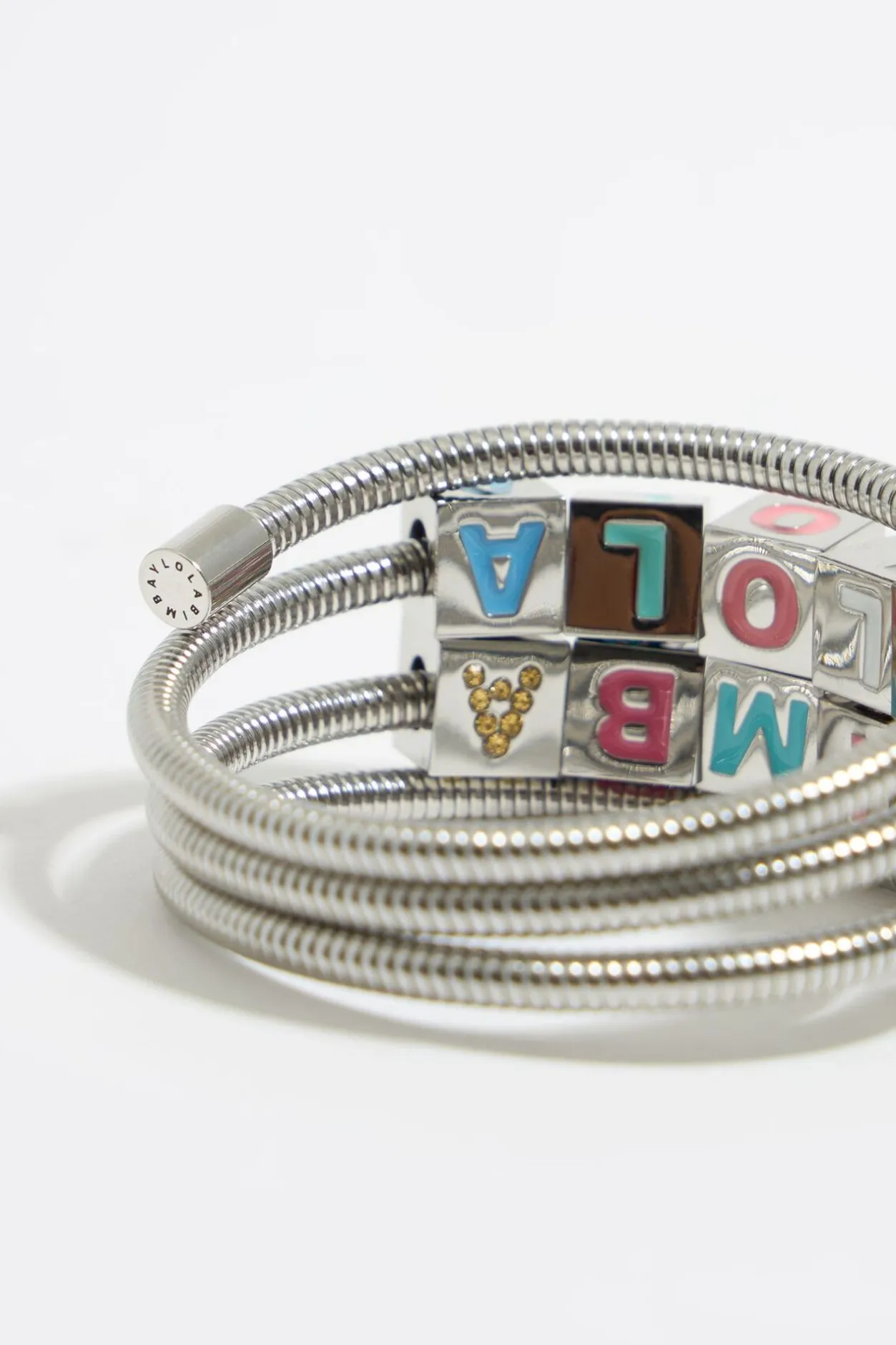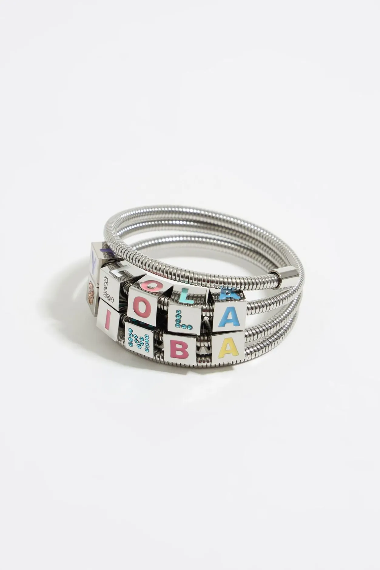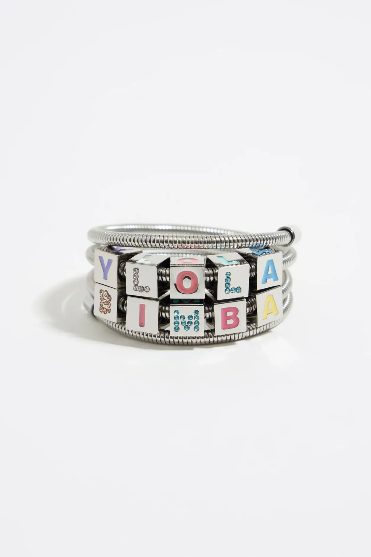 Pulsera De Muelle Personalizada Con Dados Con Letras De Logo Multicolor Y Cristales En Color Plateado.