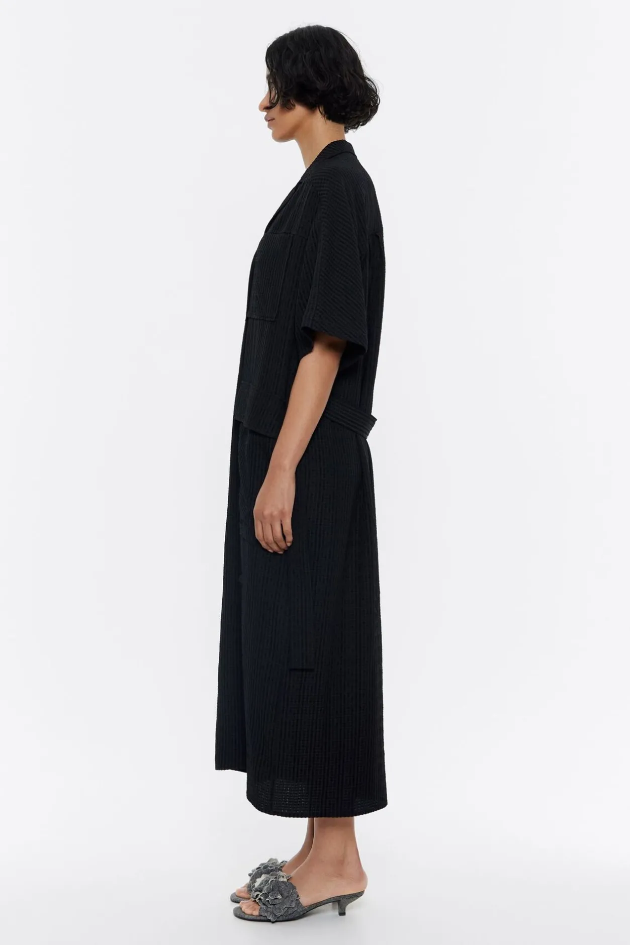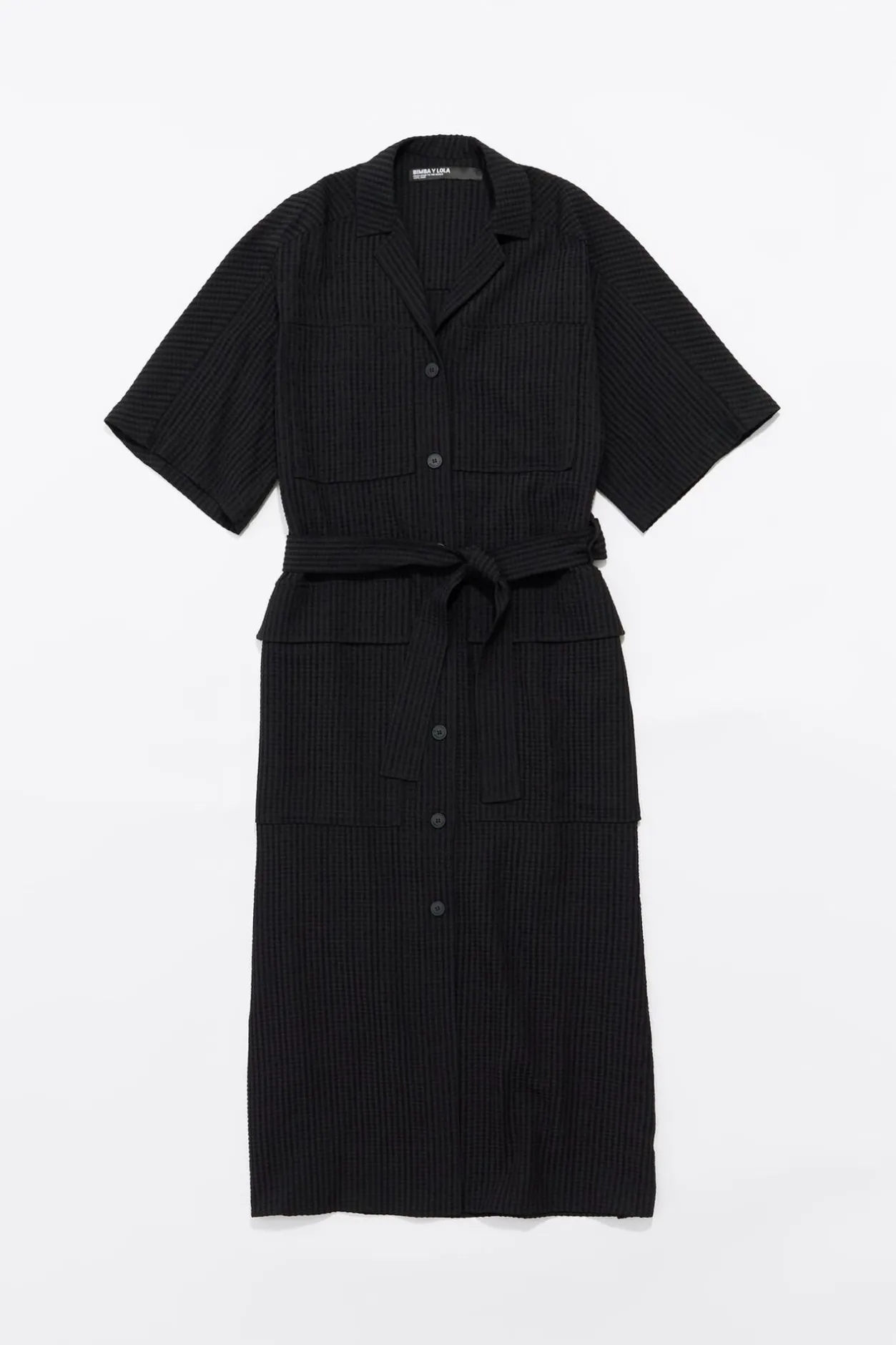 Vestido Largo De Viscosa Con Textura En Color Negro. Modelo De Corte Recto, Con Cuello Camisero Con Solapas, Manga Corta Y Cierre Frontal De Botonadura. Bolsillos PlastrÓN En El Pecho, Bolsillos Con Tapeta En Bajo Delantero Y CinturÓN De Tejido.