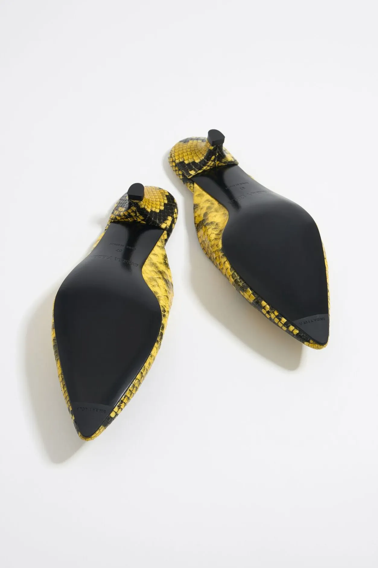 Zapato SalÓN Destalonado De Piel Con Print De Serpiente En Color Amarillo. Modelo Acabado En Punta Con Logo Lb MetÁLico En La Puntera Y TacÓN Forrado. Plantilla De Piel Con Logo Grabado Y Suela Personalizada.