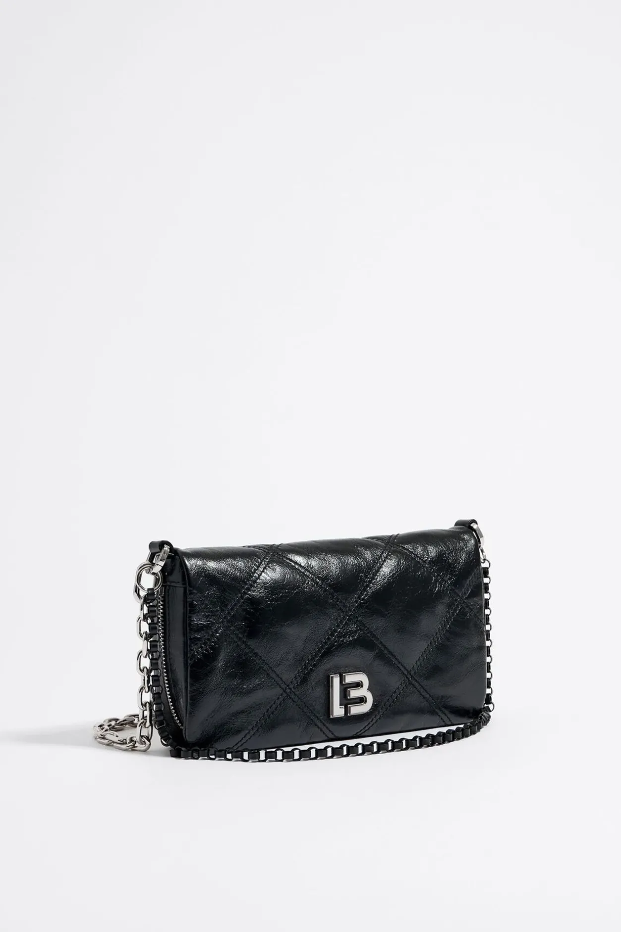 Bolso Bandolera De Piel En Color Negro. Modelo De TamaÑO PequeÑO, Con Cierre De Cremallera Y Doble Asa, De Cadena Corta Con Detalle Y Bandolera. Exterior Personalizado Con Logo Lb MetÁLico.