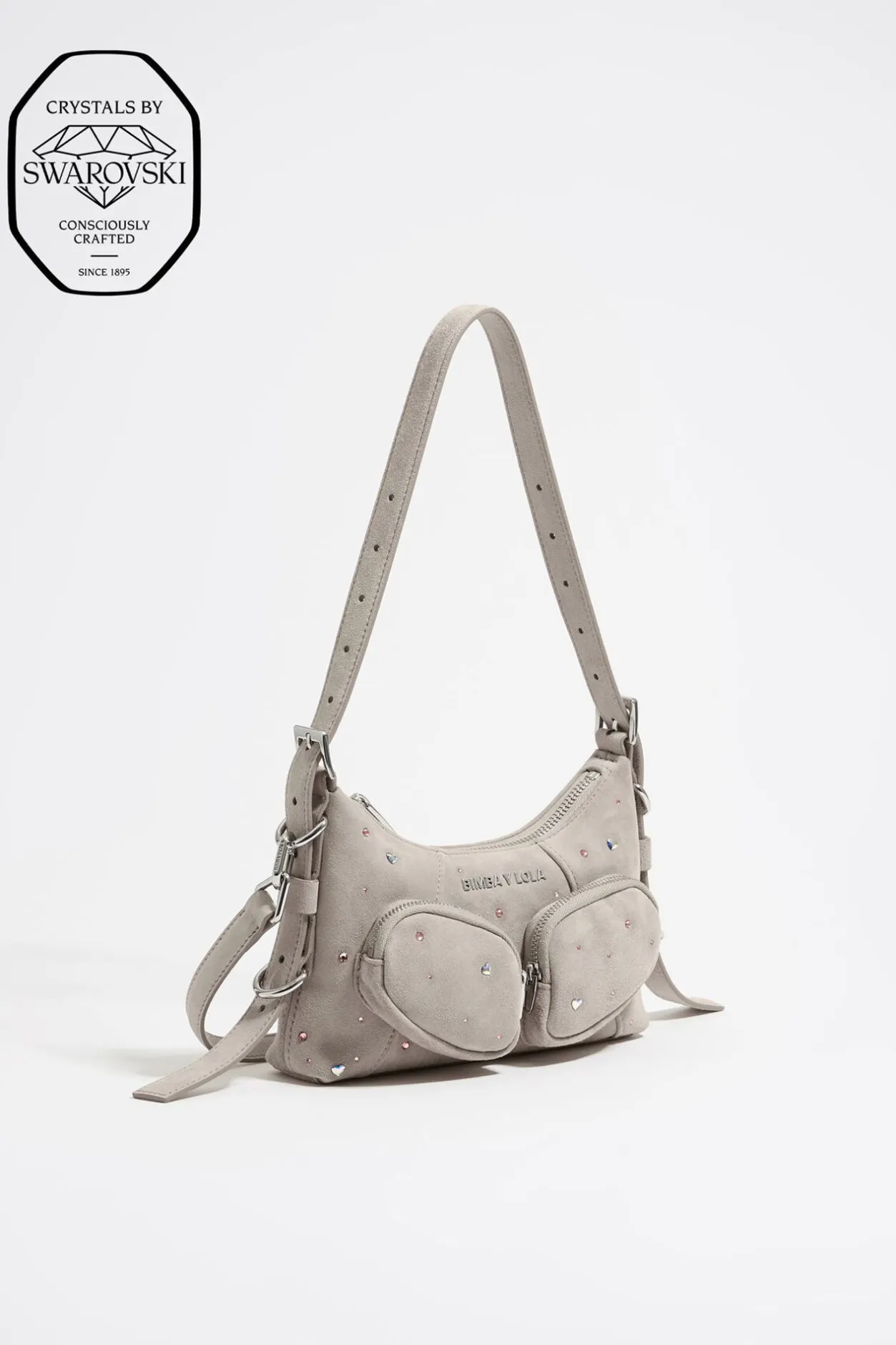 Bolso Hobo Pocket De Piel En Color Piedra Con Cristales De Swarovski. Modelo De TamaÑO Mini, Cierre De Cremallera Y Doble Asa Ajustable, De Hombro Y Bandolera De Piel. Exterior Personalizado Con Logo MetÁLico. Este Modelo Contiene 100% PoliÉSter Reciclado.