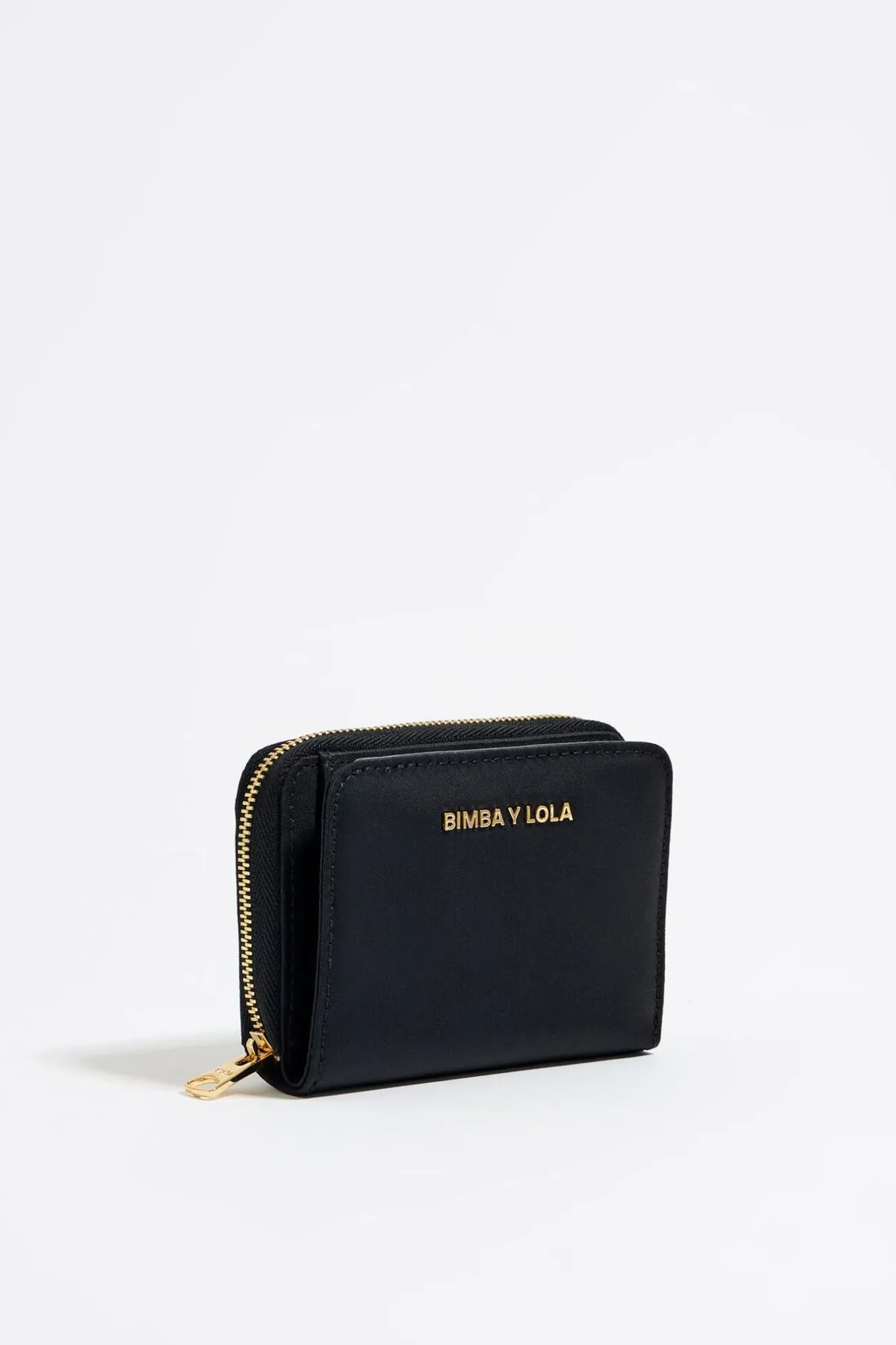 Cartera Con Solapa De Nylon En Color Negro. Modelo Con Cierre De Cremallera Y Snap, Y Tarjetero Interior. Exterior Personalizado Con Logo MetÁLico.