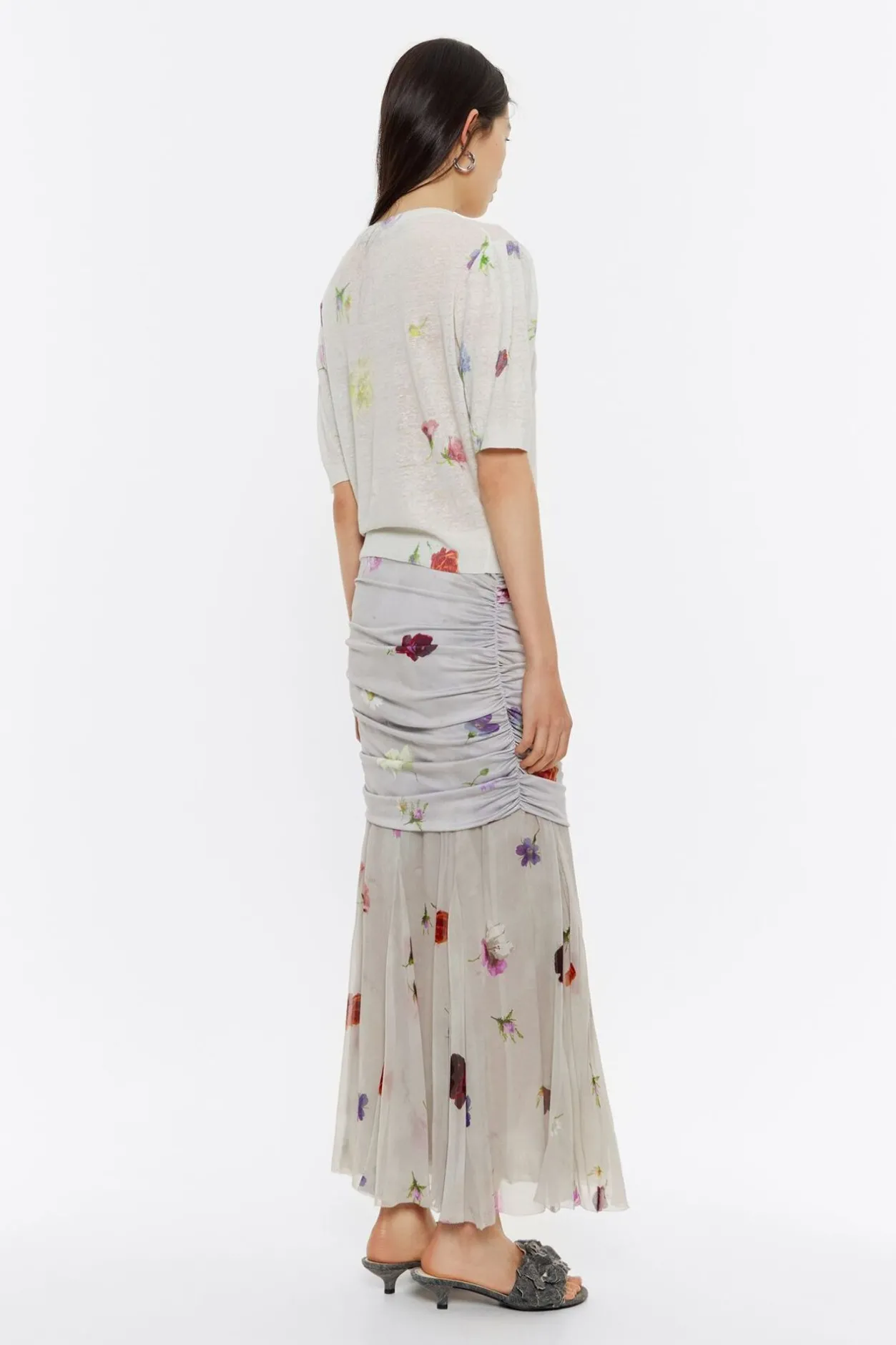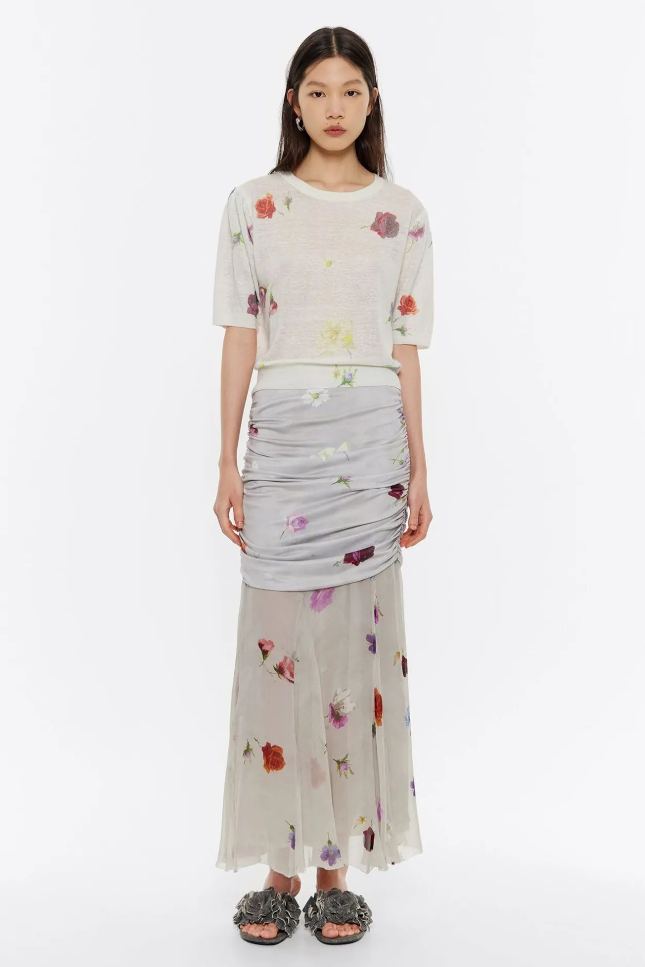 Falda Midi De Lyocell Seda Con Print Flowers En Color Gris. Modelo De Corte Ajustado, Capa Superior Fruncida En Los Laterales Y Capa Inferior Con Vuelo.