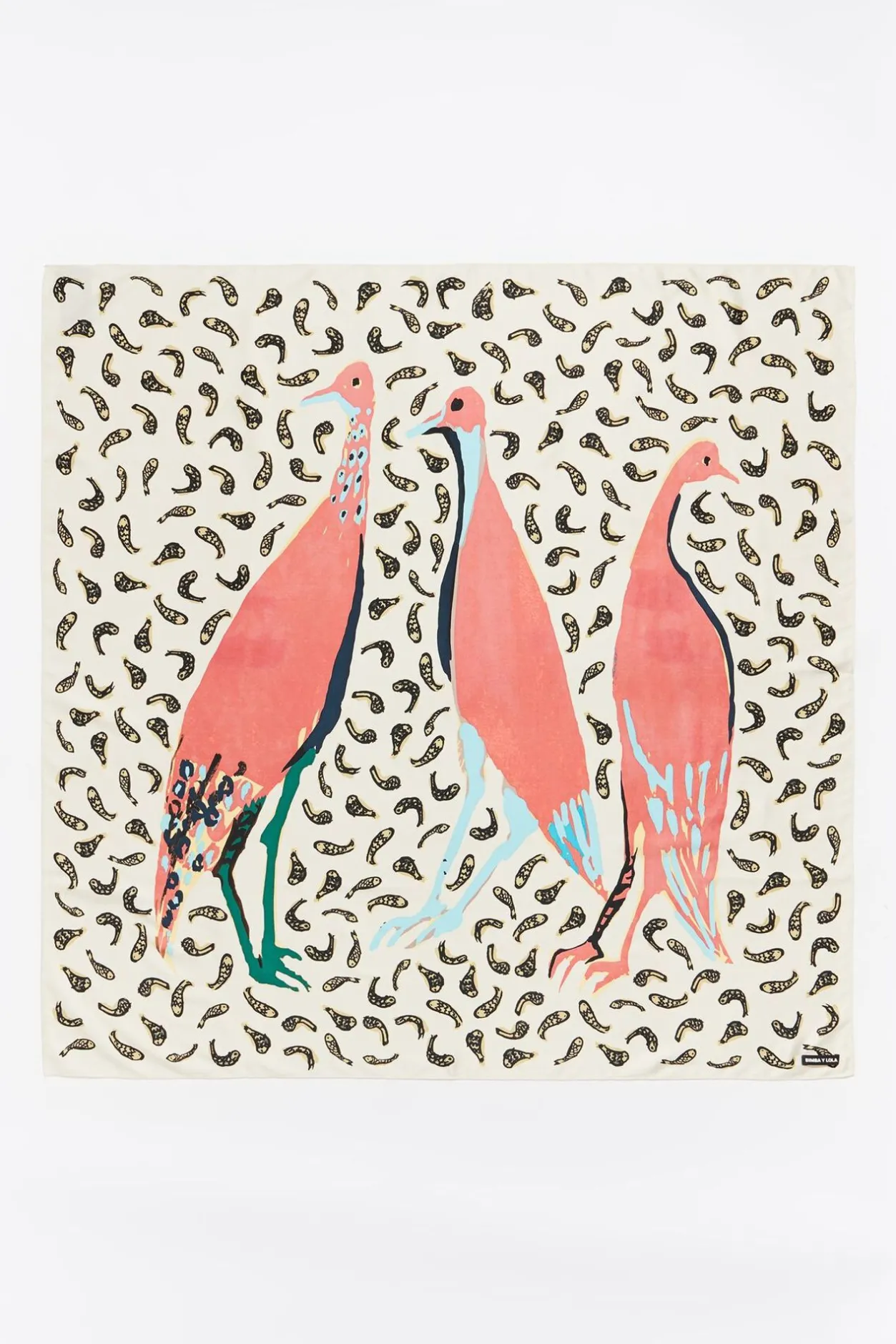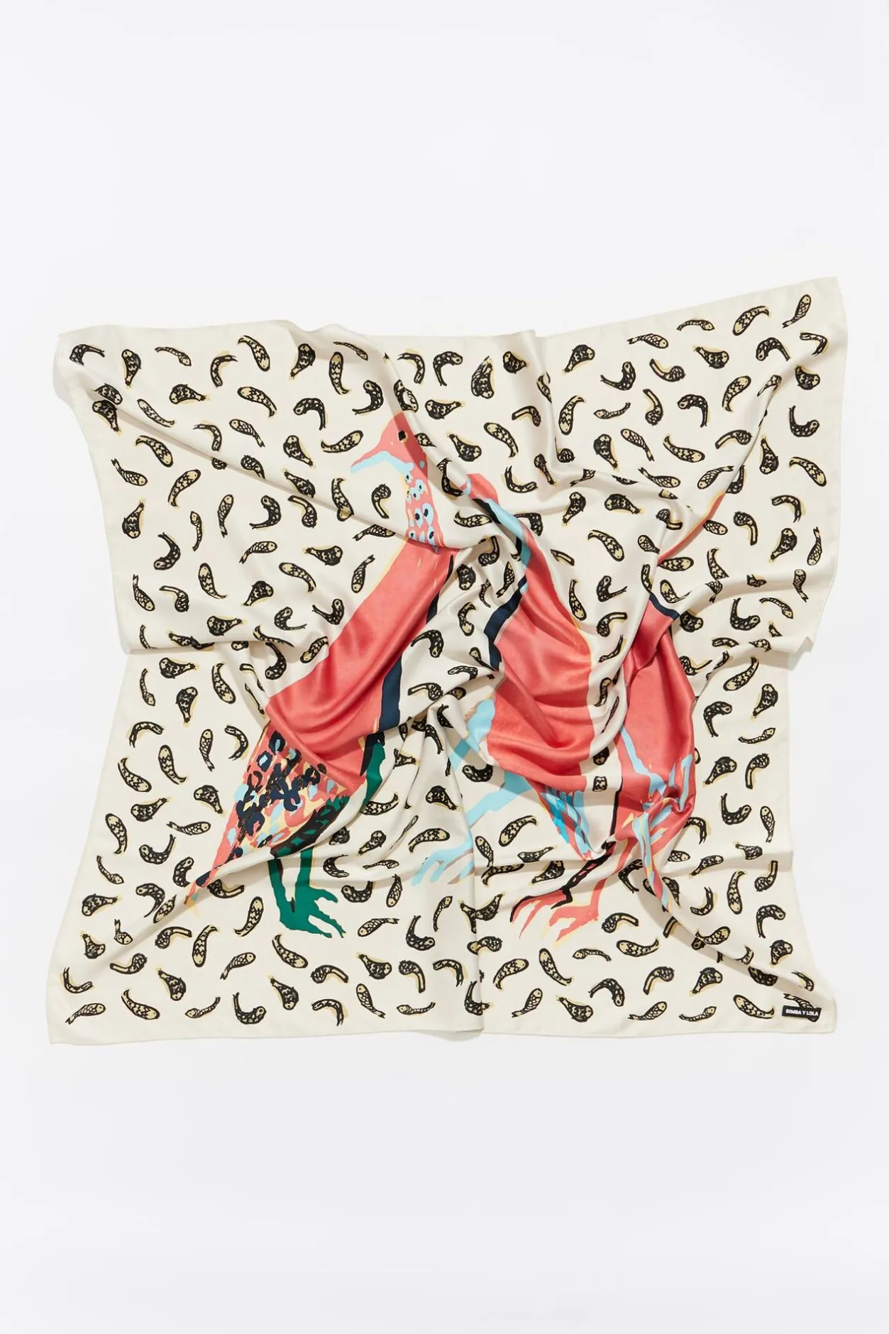 PaÑUelo Cuadrado Con Estampado De Patos Y Peces Multicolor Sobre Fondo Blanco. Modelo Personalizado Con Etiqueta Con Logo.