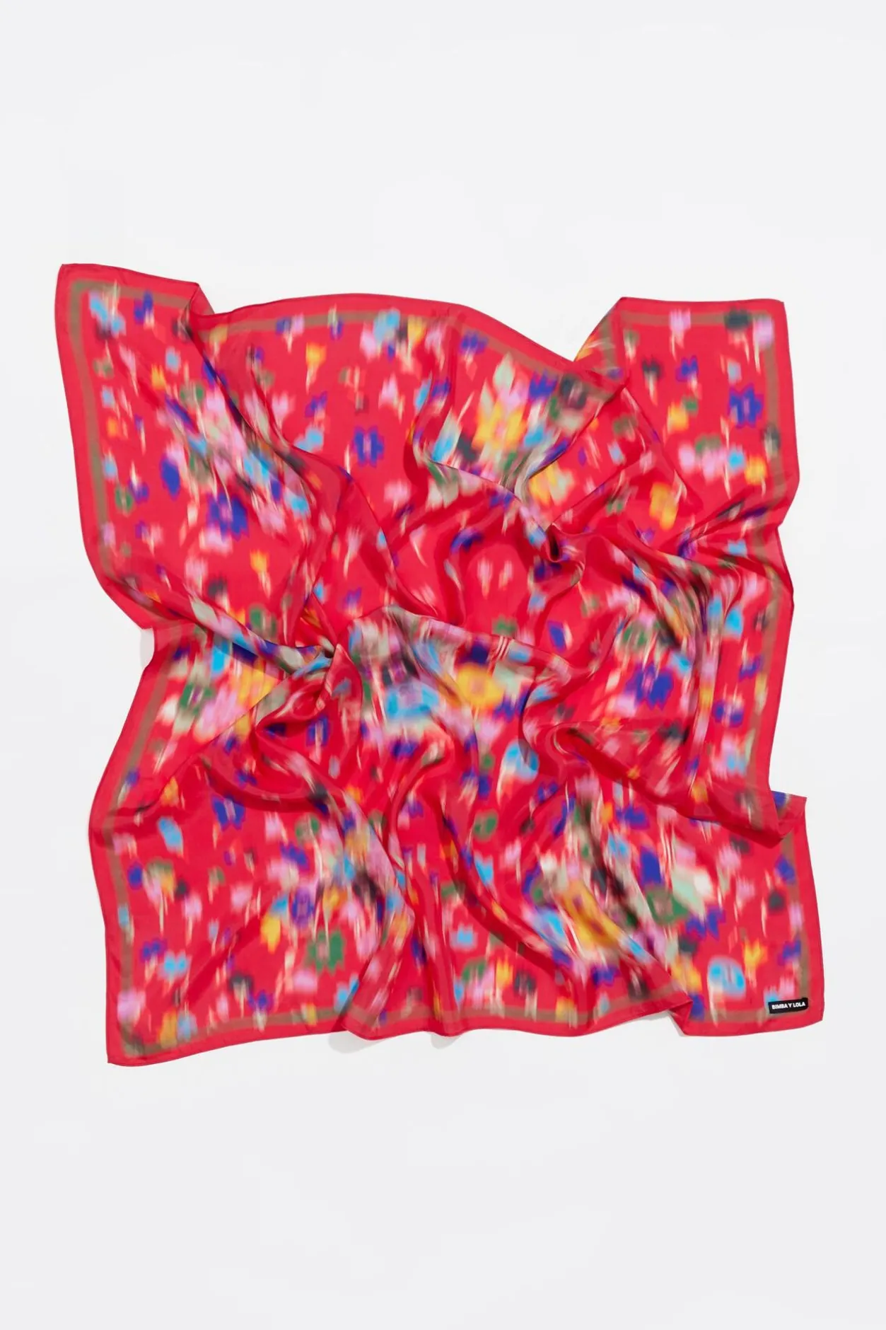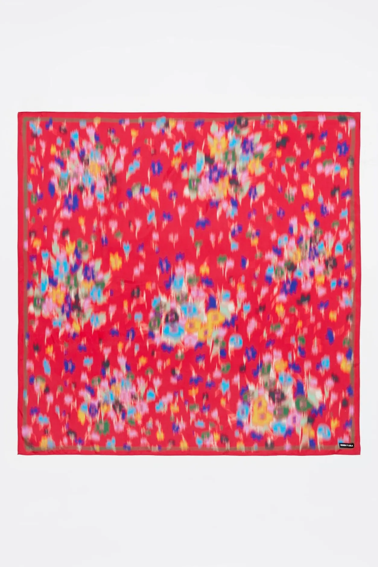 PaÑUelo Cuadrado Con Estampado De Flores Difuminadas En Grupos Sobre Fondo Color Fresa. Modelo Personalizado Con Etiqueta Logo.