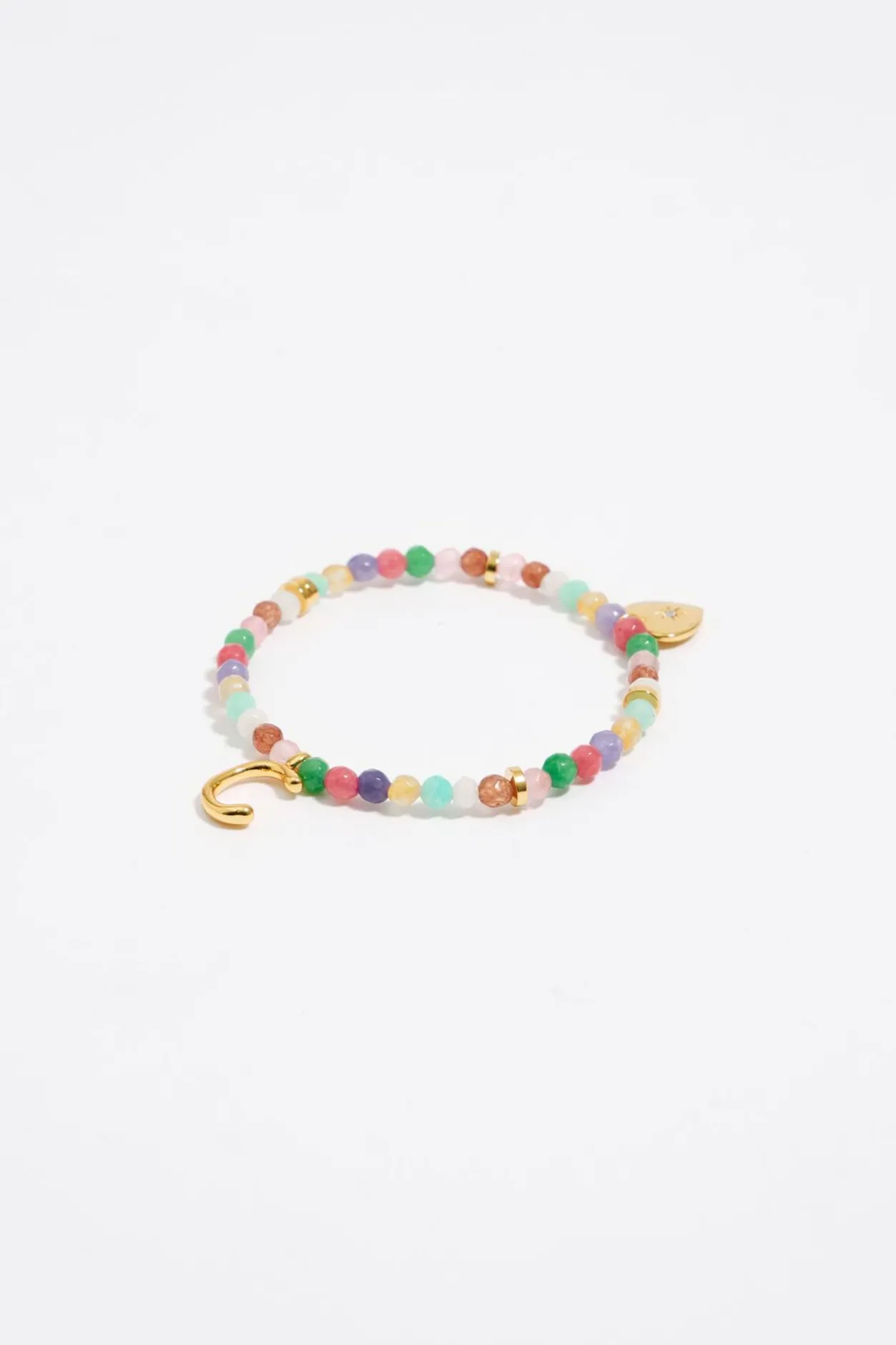 Pulsera ElÁStica De Piedras Multicolores Con Letra C De Metal Dorado. Modelo Con Pieza En Forma De CorazÓN De Metal Dorado Con Cristal.