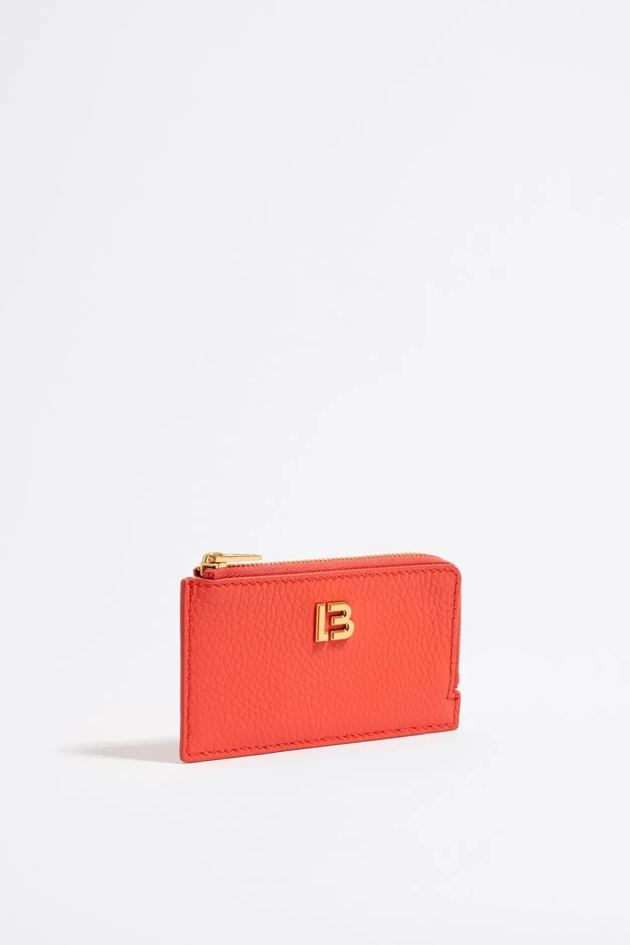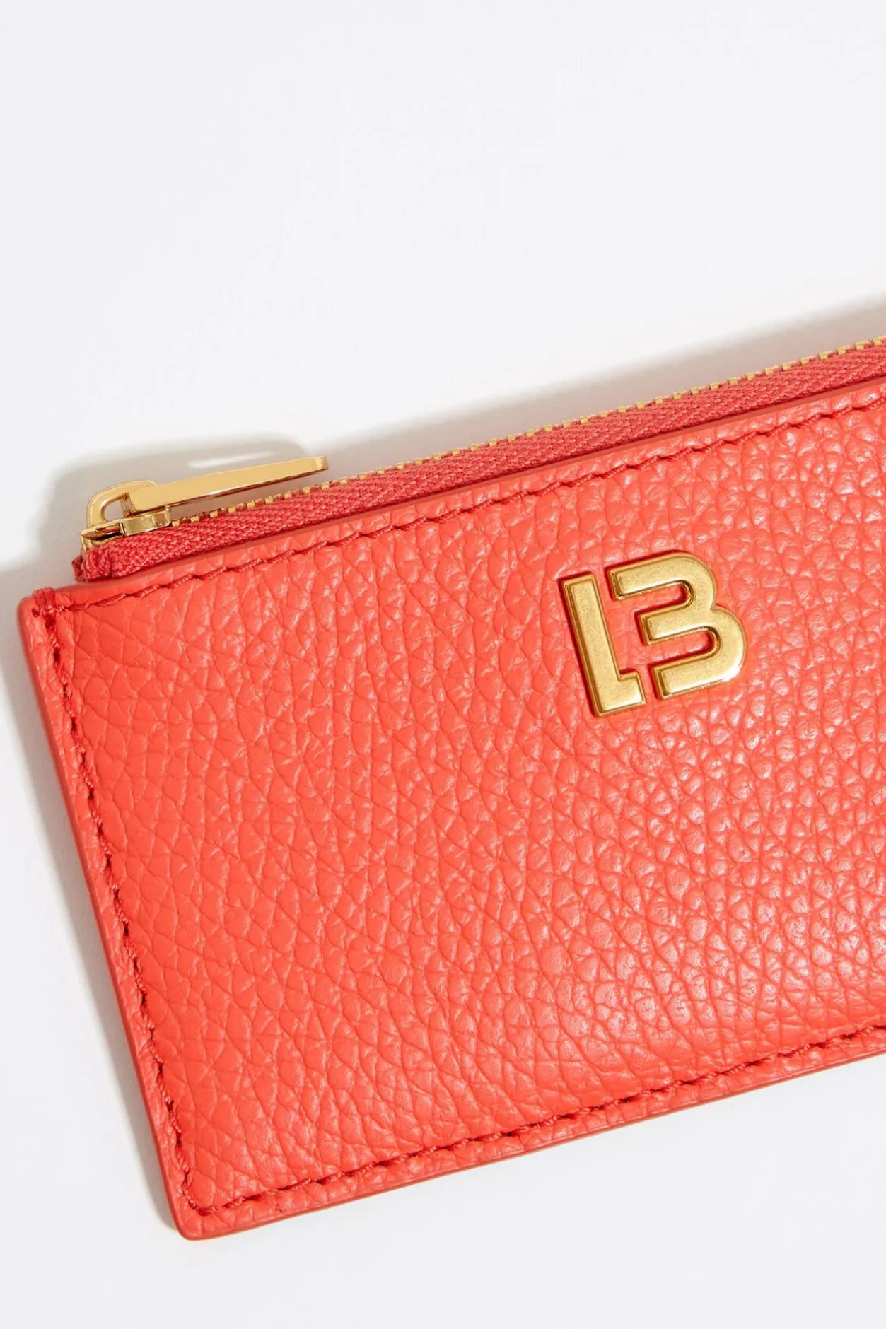Tarjetero-Monedero De Piel En Color Coral. Modelo Con Cierre De Cremallera Y Tarjetero Exterior. Exterior Personalizado Con Logo Lb.