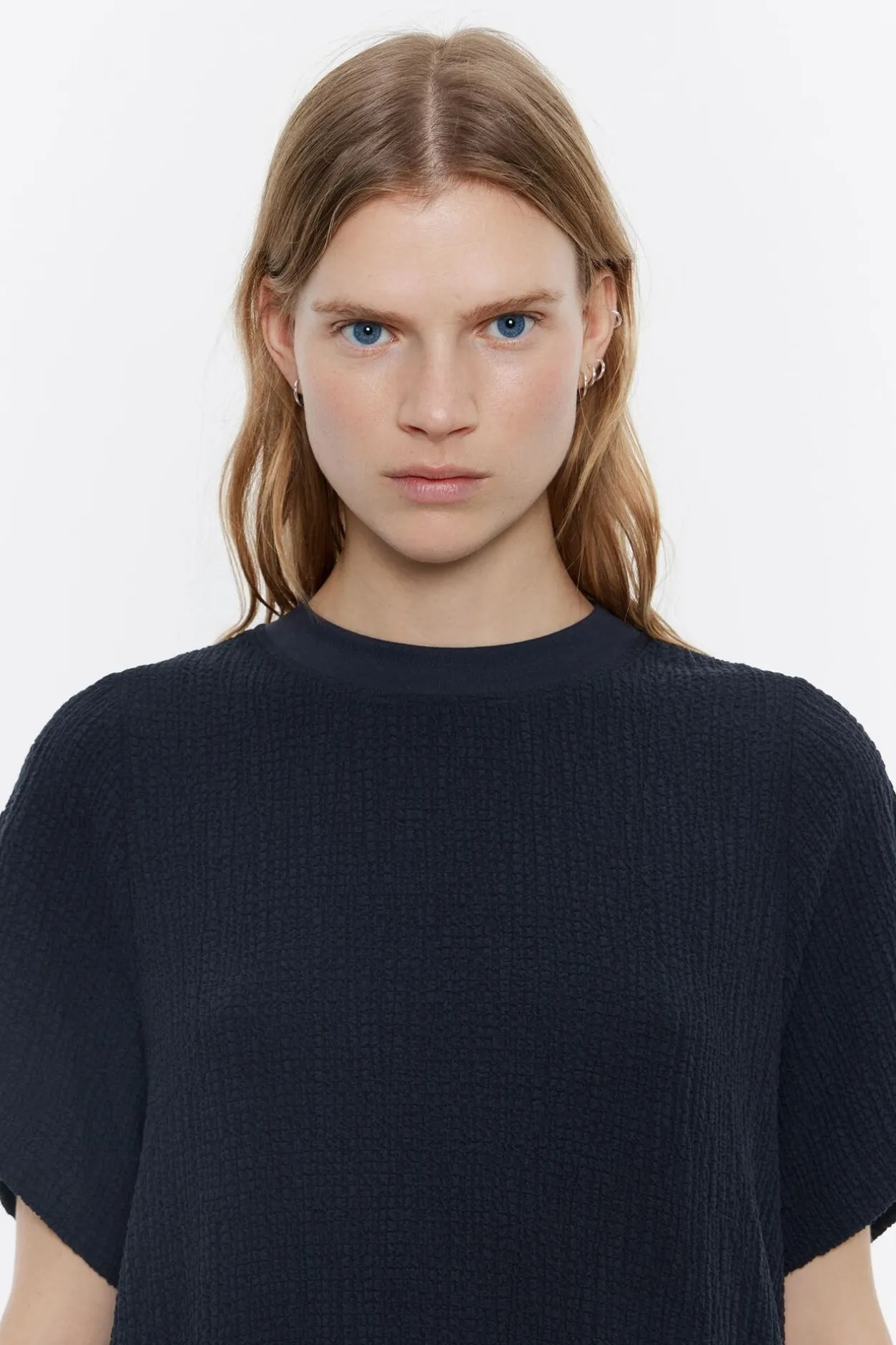 Top Largo De Viscosa Con Textura En Color Antracita. Modelo De Corte LÍNea A, Cuello Caja Con Tira De Punto Y Manga Corta. Bajo Desflecado.