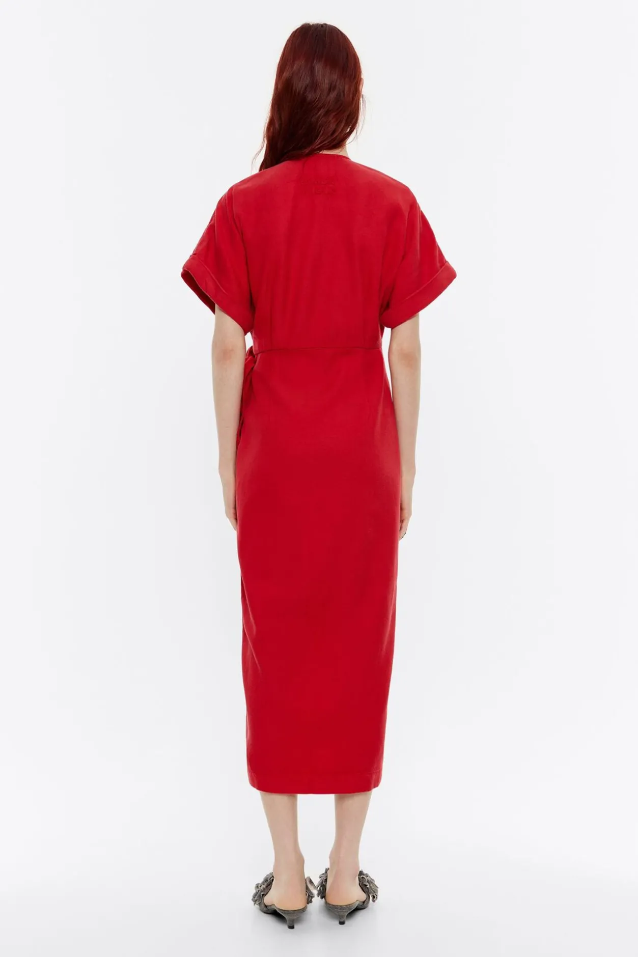 Vestido Cruzado De AlgodÓN En Color Rojo. Modelo De Corte Recto, Largo Midi, Escote En V Pronunciado Y Manga Corta Con Vuelta En El PuÑO. Cintura Con Lazo Y Exterior Personalizado Con Logo Bordado.