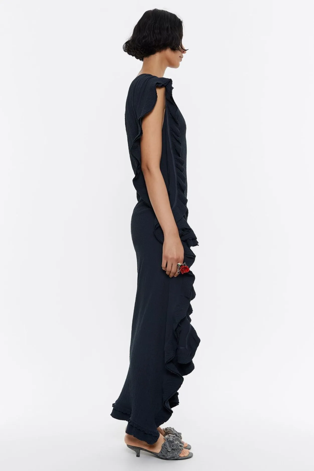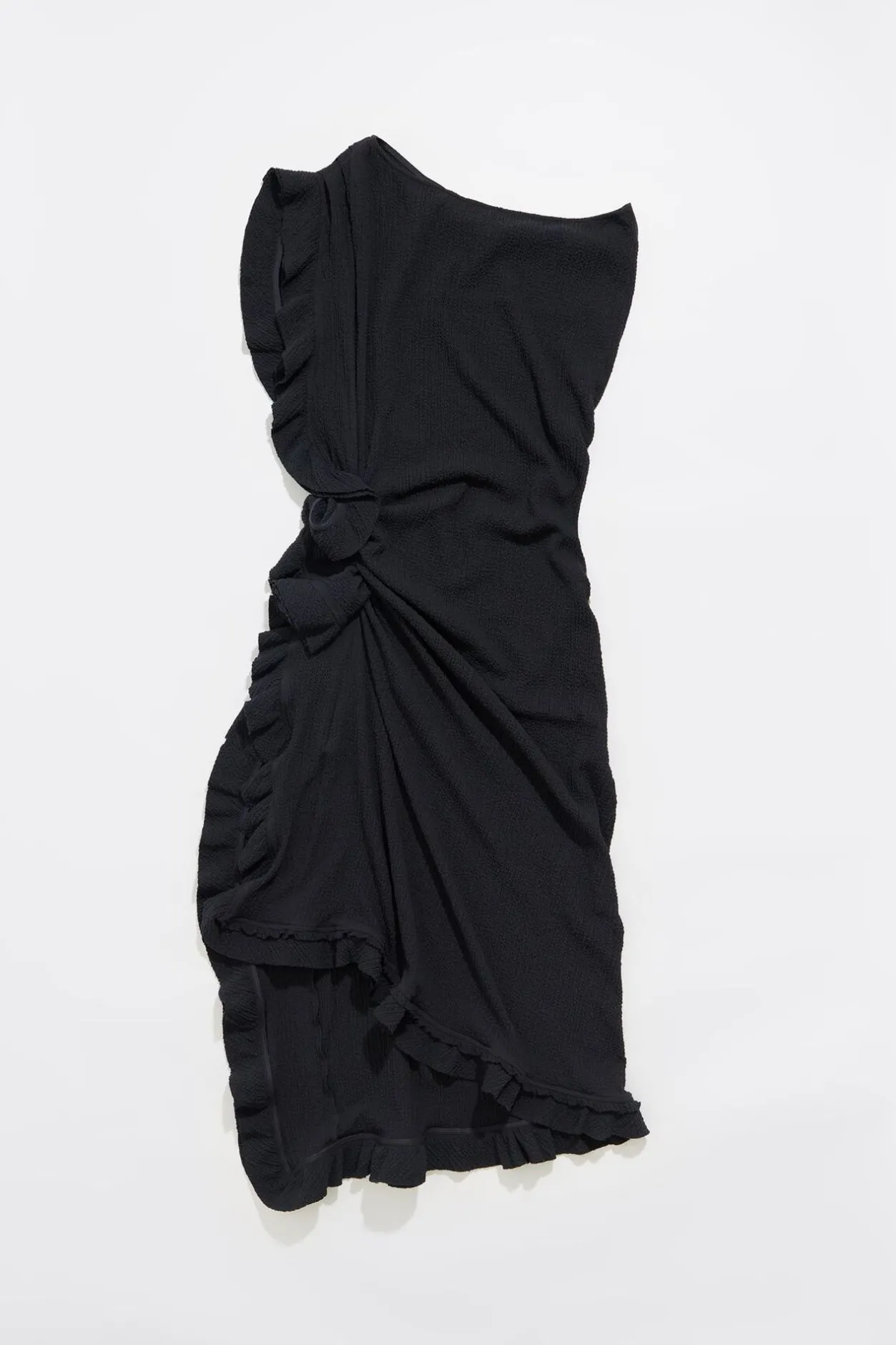 Vestido Midi Fruncido De Viscosa Con Textura En Color Antracita. Modelo De Corte Ajustado, Escote Recto Sin Un Hombro, Manga Sisa Con Volantes Y Volantes Superpuestos En Un Lateral De La Prenda.