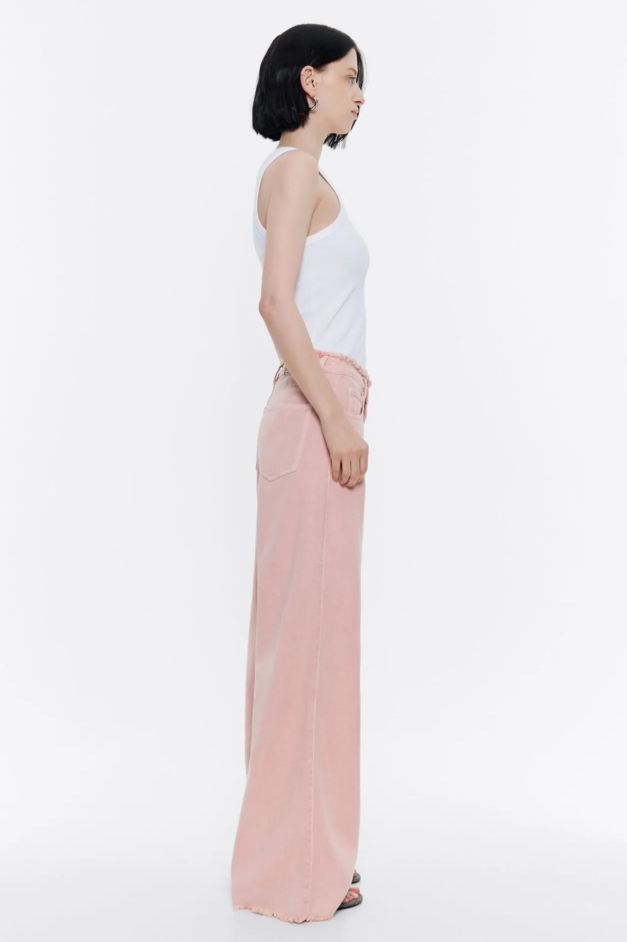 PantalÓN Vaquero En Color Rosa. Modelo De Corte Wide Leg, Tiro Alto, Cierre Frontal Con BotÓN Denim Y Cinco Bolsillos. Desflecado En Cintura. Este Modelo Contiene 20% AlgodÓN Reciclado.