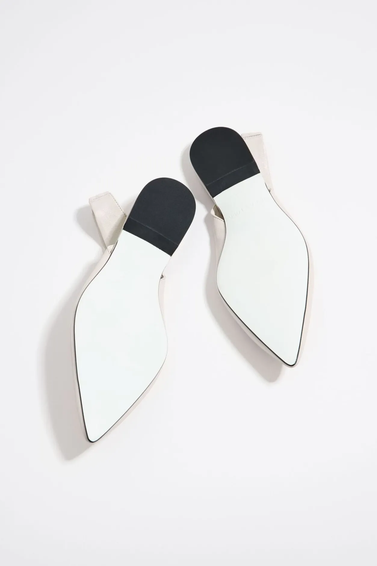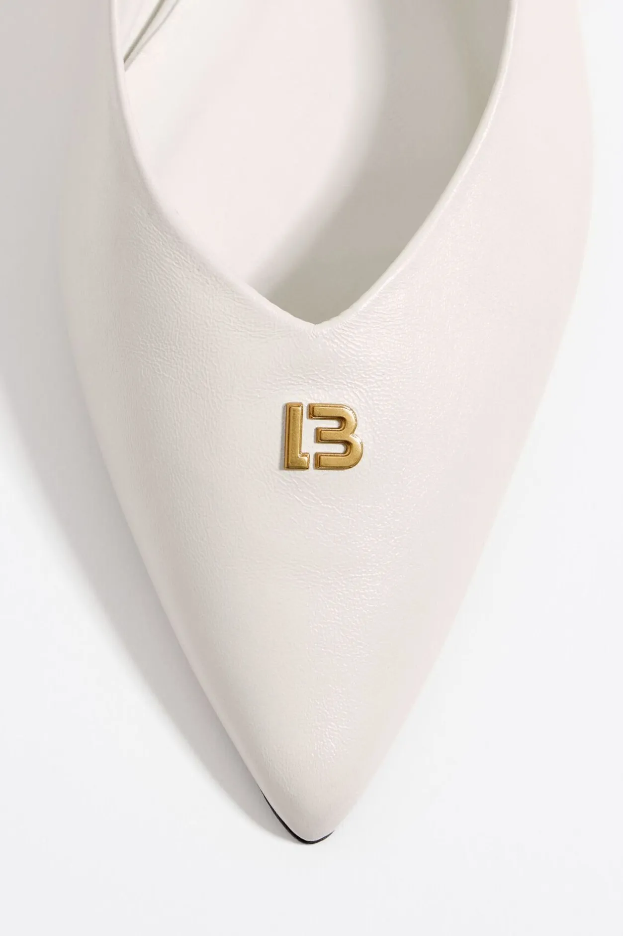 Bailarina De Piel Acabada En Punta Con Logo Lb MetÁLico En La Puntera En Color Marfil. Modelo Destalonado Con ElÁStico Trasero. Plantilla De Piel Con Logo Grabado Y Suela Personalizada.