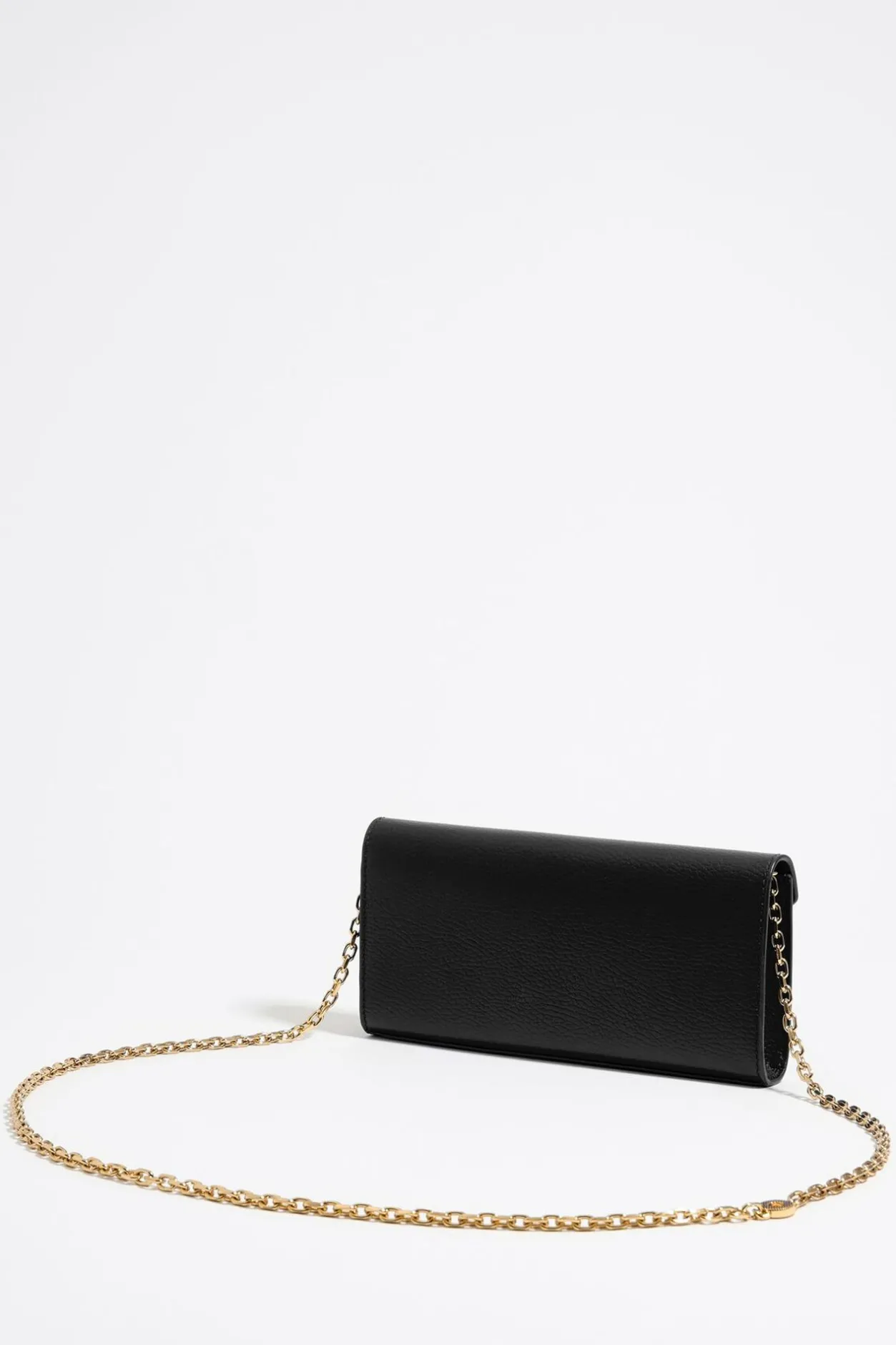Bolso Solapa De Piel En Color Negro. Modelo De TamaÑO Mini, Con Cierre De Snap Y Asa Larga De Cadena. Exterior Personalizado Con Logo Grabado En El Cierre.