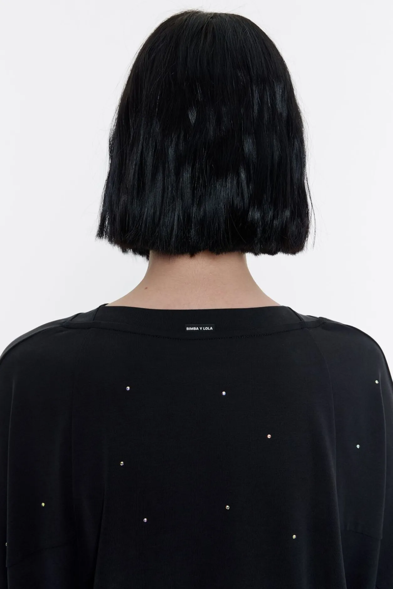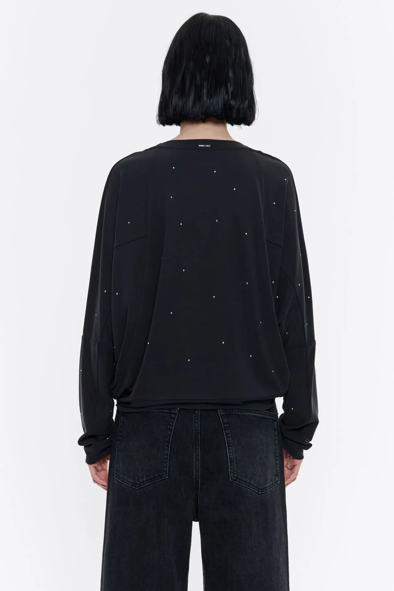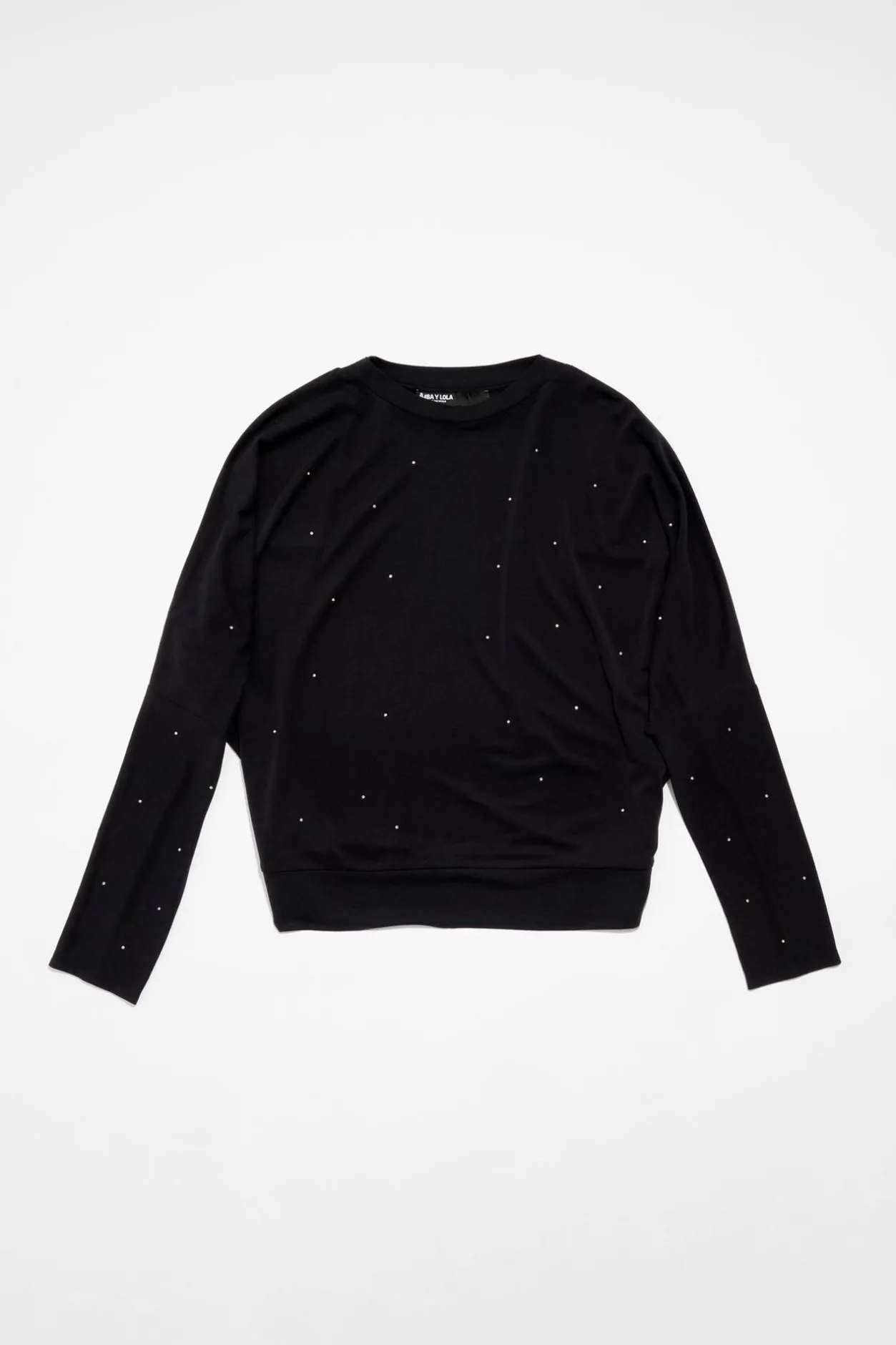 Camiseta Con Piedras Multicolores En Color Negro Lavado. Modelo De Corte MurciÉLago, Cuello Redondo Y Manga Larga.