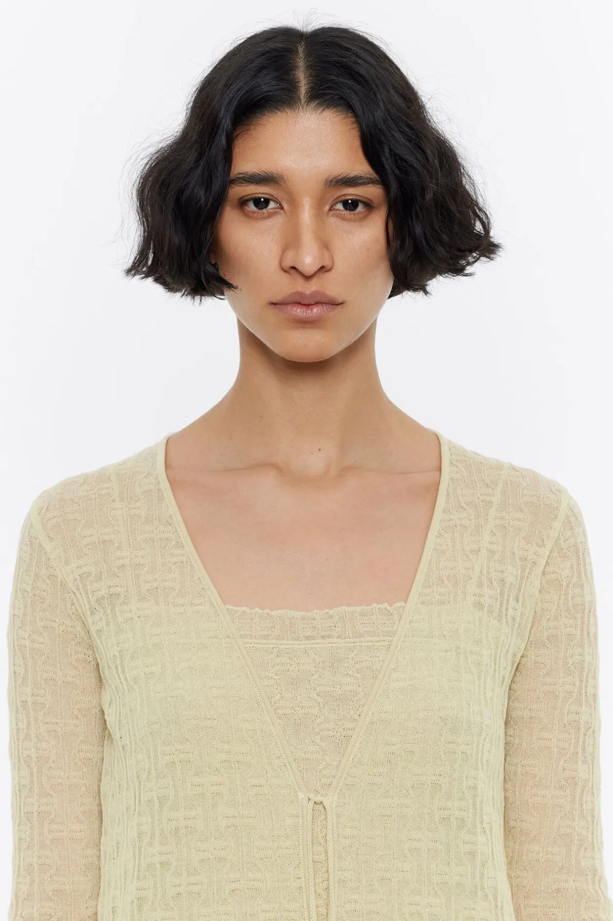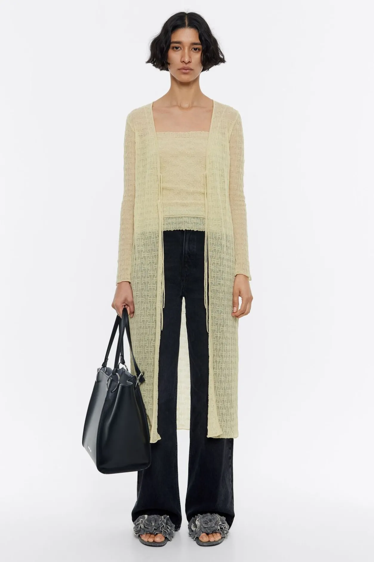 CÁRdigan Ajustada Larga De Punto En Color Lima. Modelo Con Escote Pico, Manga Larga Ajustada Y Cierre Frontal Con Lazos.