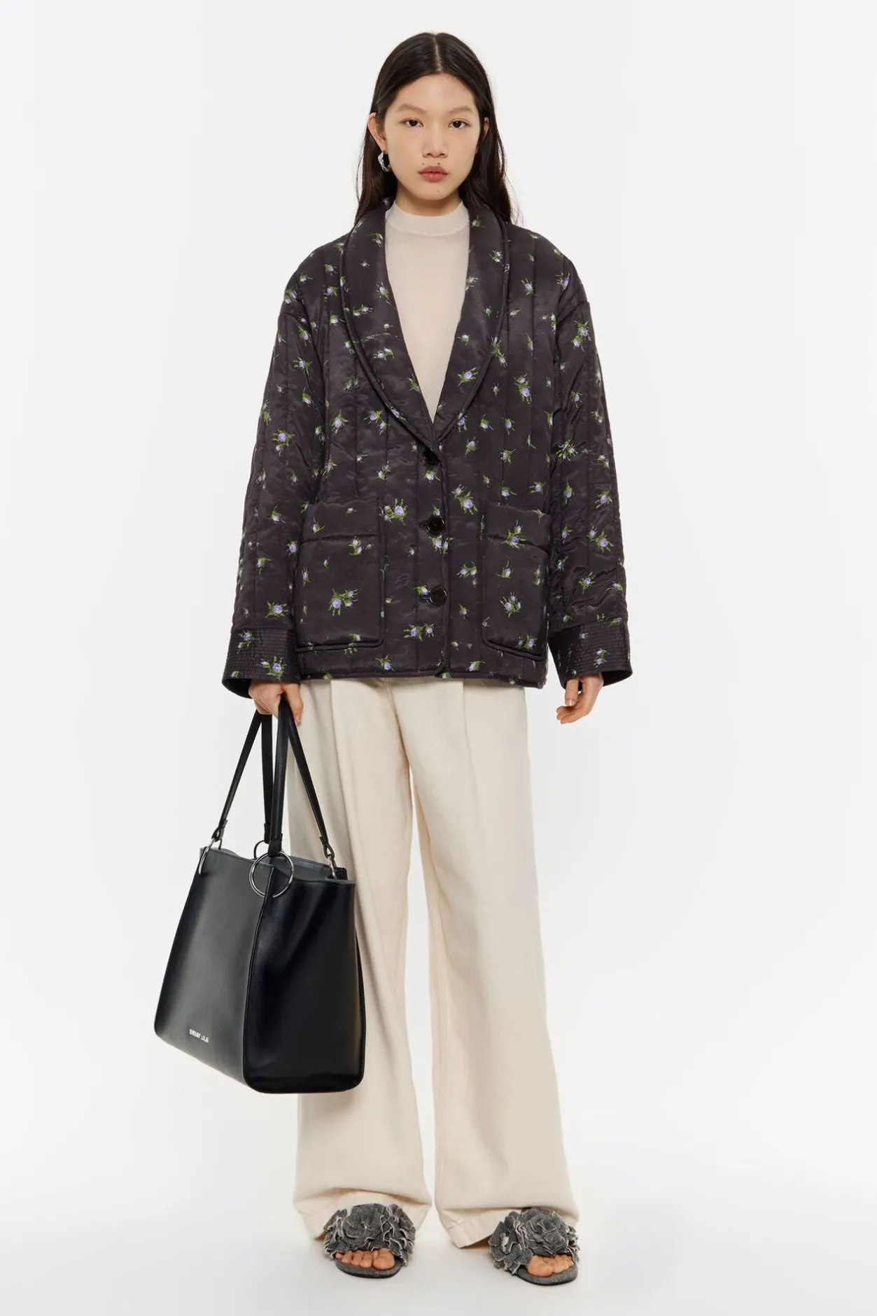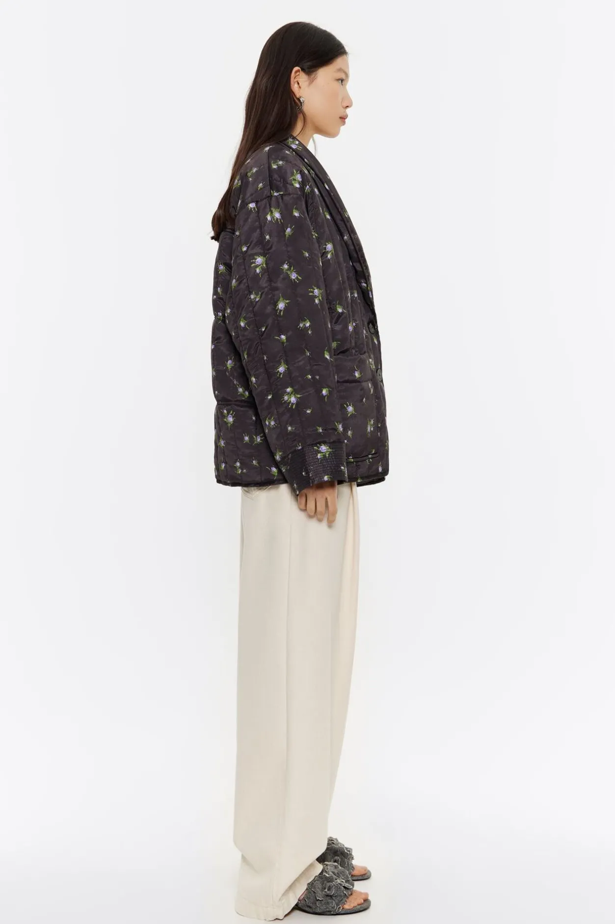 Cazadora Acolchada De Viscosa Con Print Flowers En Negro Y Lila. Modelo De Corte Recto, Escote Con Solapas Con Cruce, Manga Larga Y Cierre De Botonadura Frontal. Bolsillos De PlastrÓN Frontales Y PuÑOs Pespunteados. Este Modelo Contiene 90% PoliÉSter Reciclado.