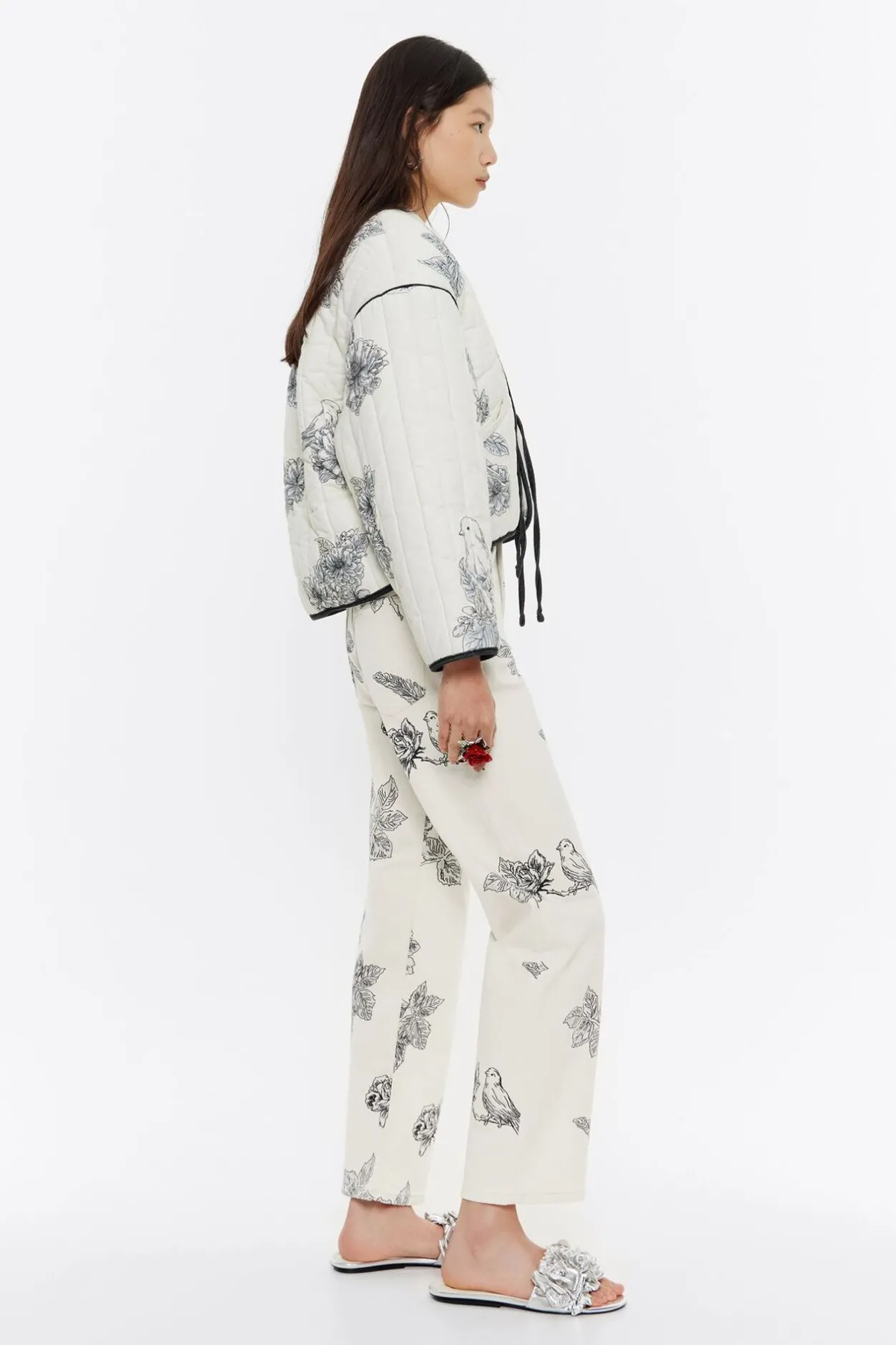Cazadora Corta Acolchada De AlgodÓN Con Print Canary Pop En Color Blanco. Modelo Con Escote Caja, Manga Larga Con Vivo A Contraste Y Cierre Frontal Con Lazos. Vivo A Contraste En Escote, Sisas, PuÑOs Y Bajo.