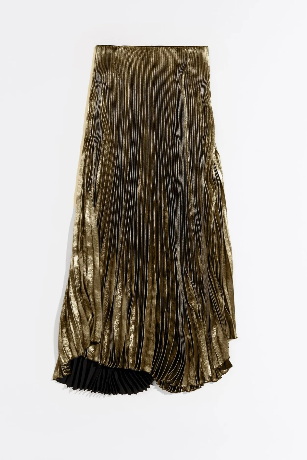 Falda Plisada En Color Dorado Con Acabado Metalizado. Modelo De Largo Midi, Con Cintura ElÁStica Y Bajo AsimÉTrico.