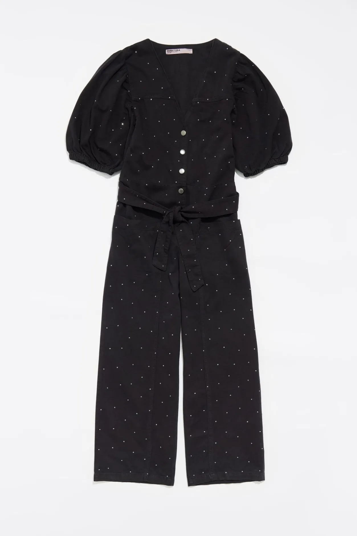 Mono Denim Con Piedras En Color Negro. Modelo De Corte Recto, Cuello Pico, Manga 3/4 Abullonada Y Botonadura Frontal. Bolsillos Frontales Y Lazada En La Cintura.
