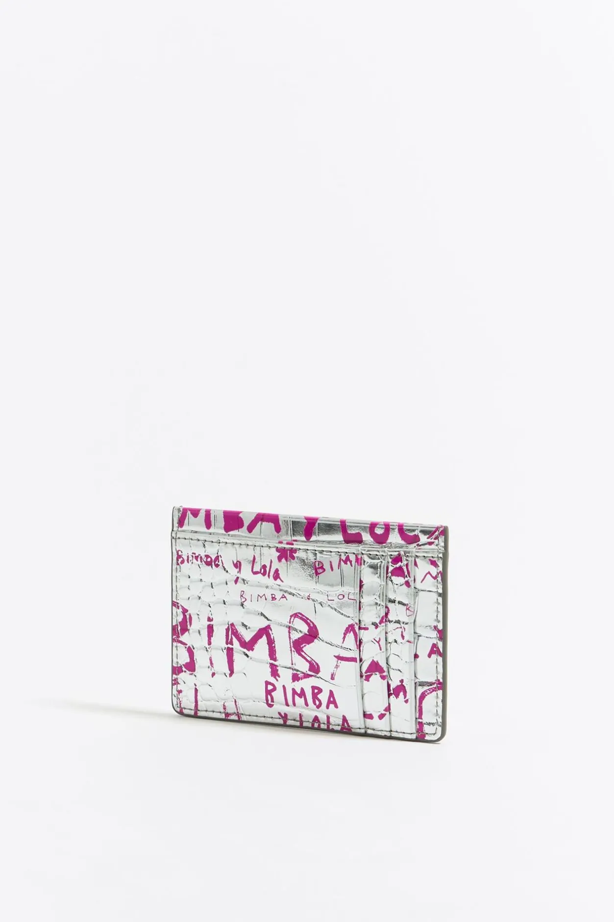 Tarjetero Con Grabado De Cocodrilo Y Print Bimbaylola.Com En Color Rosa Sobre Fondo Plata. Exterior Personalizado Con Logo MetÁLico. Este Modelo Contiene 30% Poliuretano Reciclado + 100% PoliÉSter Reciclado.