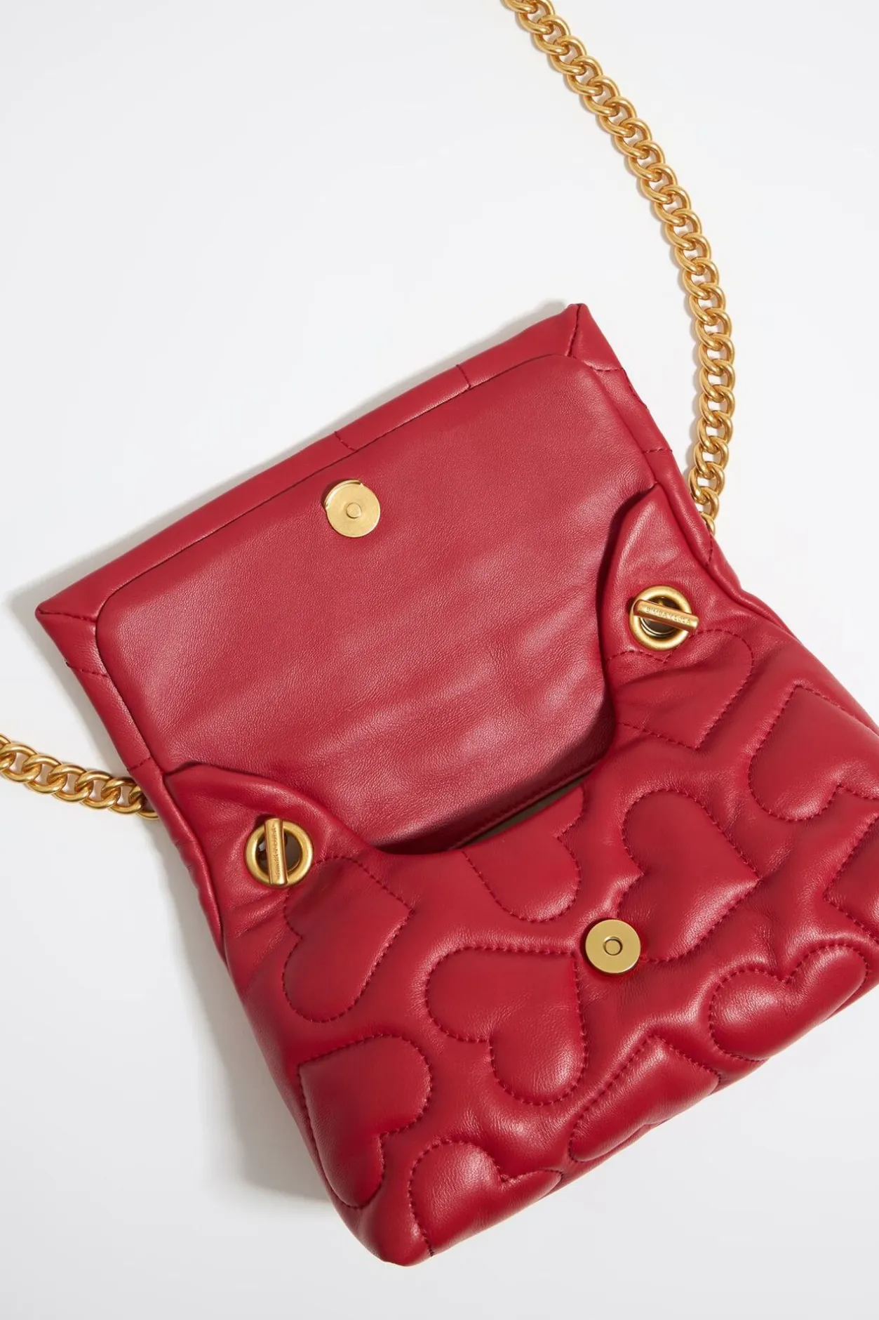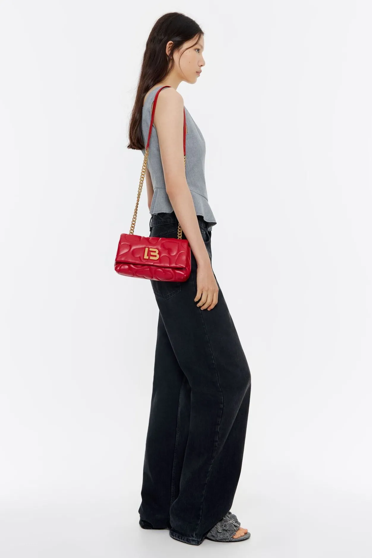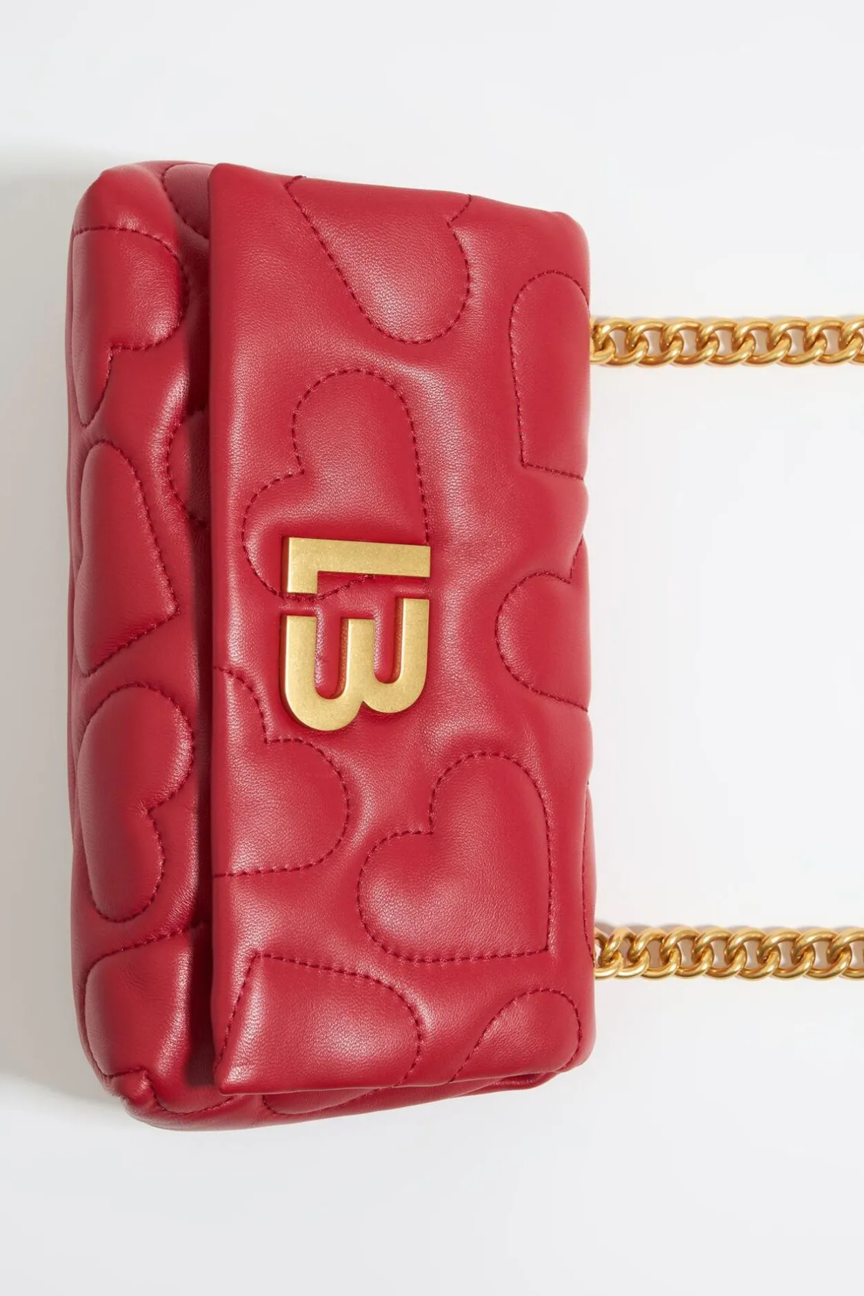 Bolso Bandolera Solapa De Piel Napa Con Corazones Bordados En Color Rojo. Modelo Con Cierre MagnÉTico, Asa Larga De Piel Y Cadena Y Bolsillo Interior. Exterior Personalizado Con Logo Lb. Este Modelo Contiene 100% PoliÉSter Reciclado.