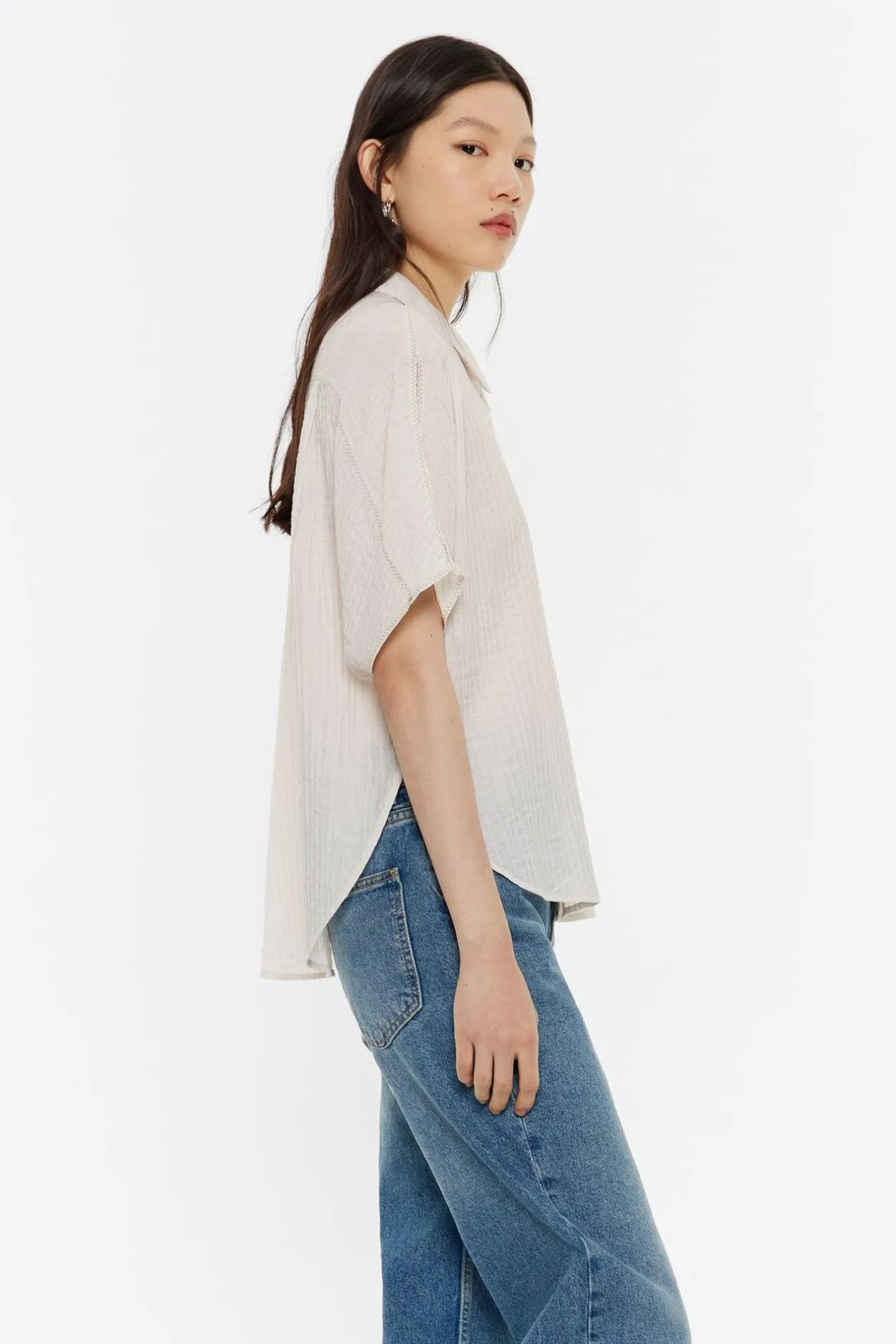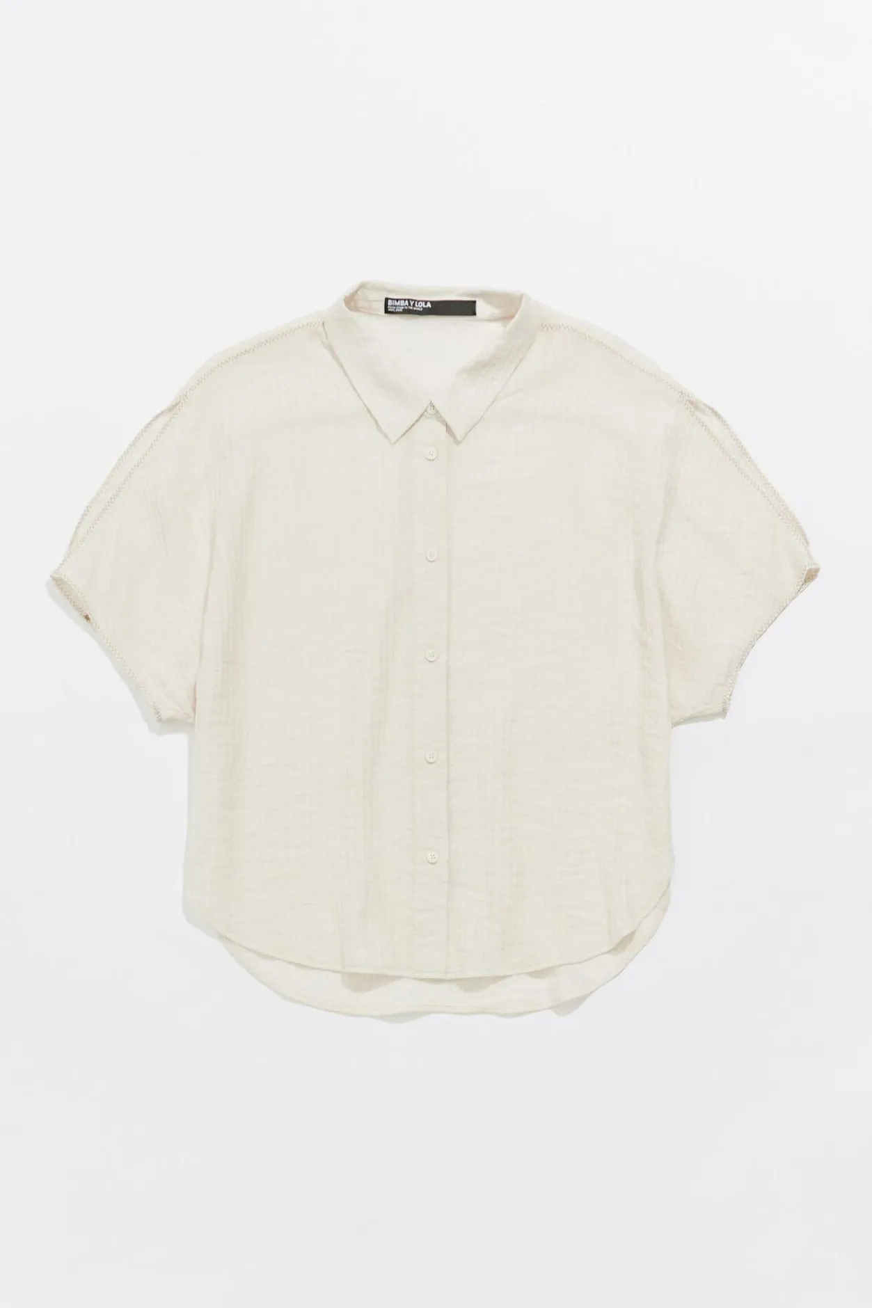 Camisa Estilo Capa Corta De Viscosa Con Textura En Color Marfil. Modelo De Corte Recto, Cuello Camisero, Manga Corta MurciÉLago Con Abertura Y Cierre Frontal De Botonadura. Pespuntes En Zigzag En Hombros, Mangas Y CanesÚ Trasero. Este Modelo Contiene 100% Viscosa De ProducciÓN Responsable.